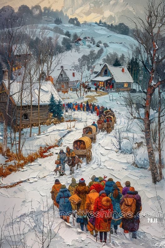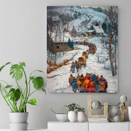 This vibrant canvas captures a heartwarming winter scene as a procession of people and horse-drawn wagons make their way through a serene, snow-blanketed village. The colorful coats of the travelers contrast beautifully with the soft white snow, reflecting the spirit of community and resilience in the face of winter's chill. The rustic cabins and glowing lights from windows add a touch of warmth and nostalgia, making this artwork a celebration of togetherness and the enduring connection to simpler times.