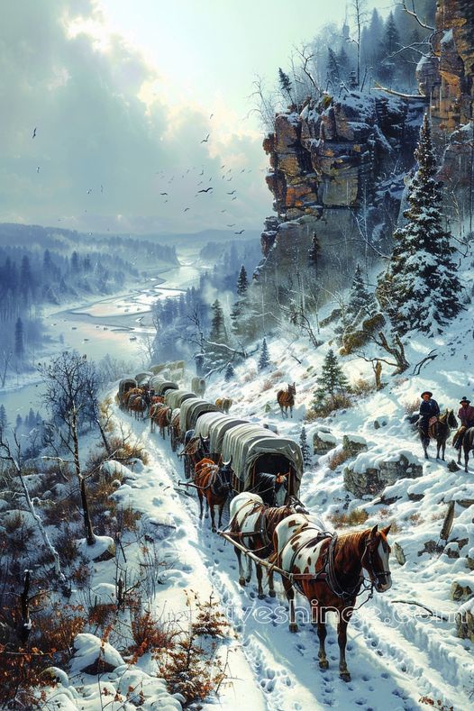 This captivating canvas depicts a caravan of covered wagons making their way through a snow-covered mountain pass. The bright winter sun illuminates the white landscape, casting soft shadows over the terrain. Horses lead the way, their breaths visible in the cold air, while riders keep close watch on the rugged trail. Towering cliffs and dense forests frame the scene, with a river winding through the valley below, adding to the sense of vastness and beauty. The determination of the travelers is palpable as they push forward on their arduous journey, embodying resilience and the spirit of exploration through challenging conditions.