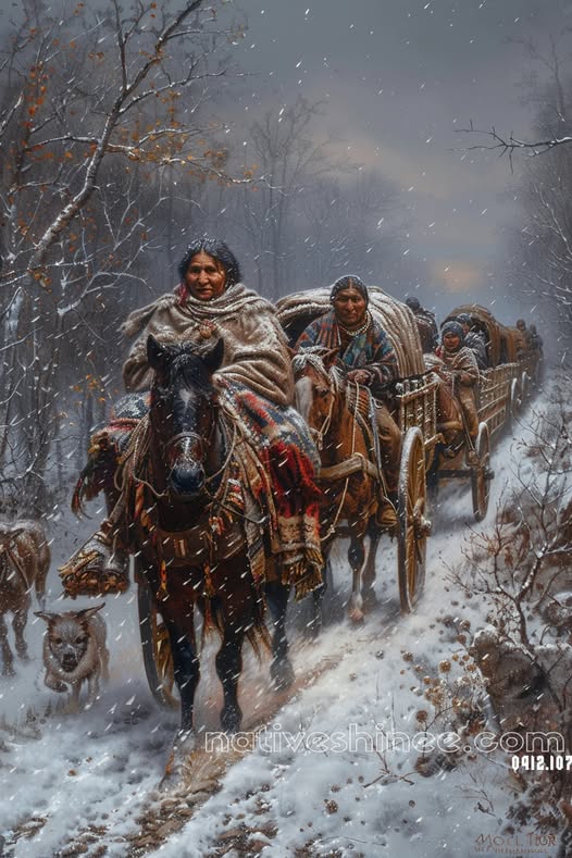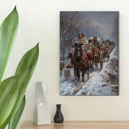 This evocative scene captures a Native American family navigating a snowy forest trail, their determined expressions shining against the harsh winter elements. The lead rider, wrapped in vibrant blankets and guiding a strong horse, leads a caravan of covered wagons filled with loved ones and possessions. Accompanied by loyal dogs, this image resonates with the resilience and unity of a people enduring the journey through nature's trials. Each detail reflects a story of survival, strength, and connection to the land. This is Journey Through Winter's Veil: A Native American Canvas