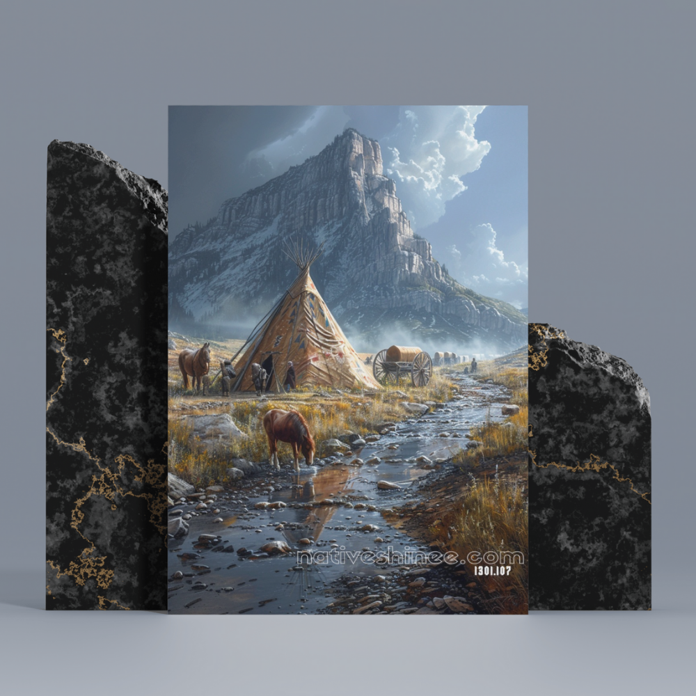 Set against the backdrop of towering mountain peaks, a peaceful Native American campsite stands at the heart of a serene valley. A lone horse drinks from the stream, while nearby, the gentle flow of the water reflects the sky’s brilliance. The village, with its distinctive teepees and carts, serves as a symbol of strength, tradition, and harmony with nature. The scene is bathed in soft light, evoking a timeless serenity. In the distance, travelers journey onward, their wagons marking the path to the horizon. The landscape is a perfect blend of rugged beauty and quiet strength, capturing a way of life deeply connected to the land.