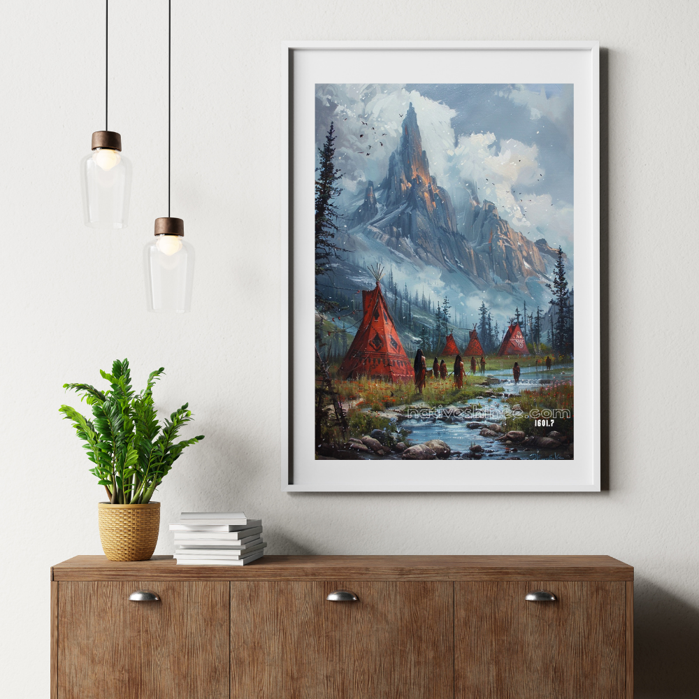 This stunning image captures the serene beauty of a Native American village nestled at the foot of towering, snow-capped mountains. The vibrant red tipis stand in stark contrast to the cool tones of the surrounding landscape, where the river winds its way through the valley. A group of warriors, dressed in traditional attire, walks along the riverbank, their presence a testament to their deep connection with the land and its sacred spirit. The majestic mountain peak looms in the distance, symbolizing strength and protection for the people below. This evocative scene is a powerful reminder of the bond between the Native American tribes and the natural world. Native American Canvas.