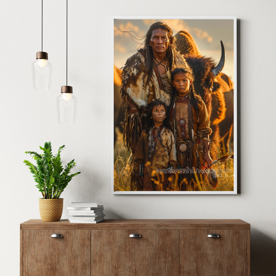 Honor the strength and unity of Native heritage with Legacy of the Plains Native American Canvas. This breathtaking artwork captures a proud Native American father standing with his children, embodying tradition, resilience, and the deep bond between generations. The warm golden hues of the setting sun and the presence of the sacred buffalo symbolize harmony with nature and ancestral wisdom. Printed on high quality durable canvas, this masterpiece is perfect for home décor or as a meaningful gift for those who appreciate cultural history. Celebrate the legacy of the plains and bring a timeless piece of art into your space – order now.