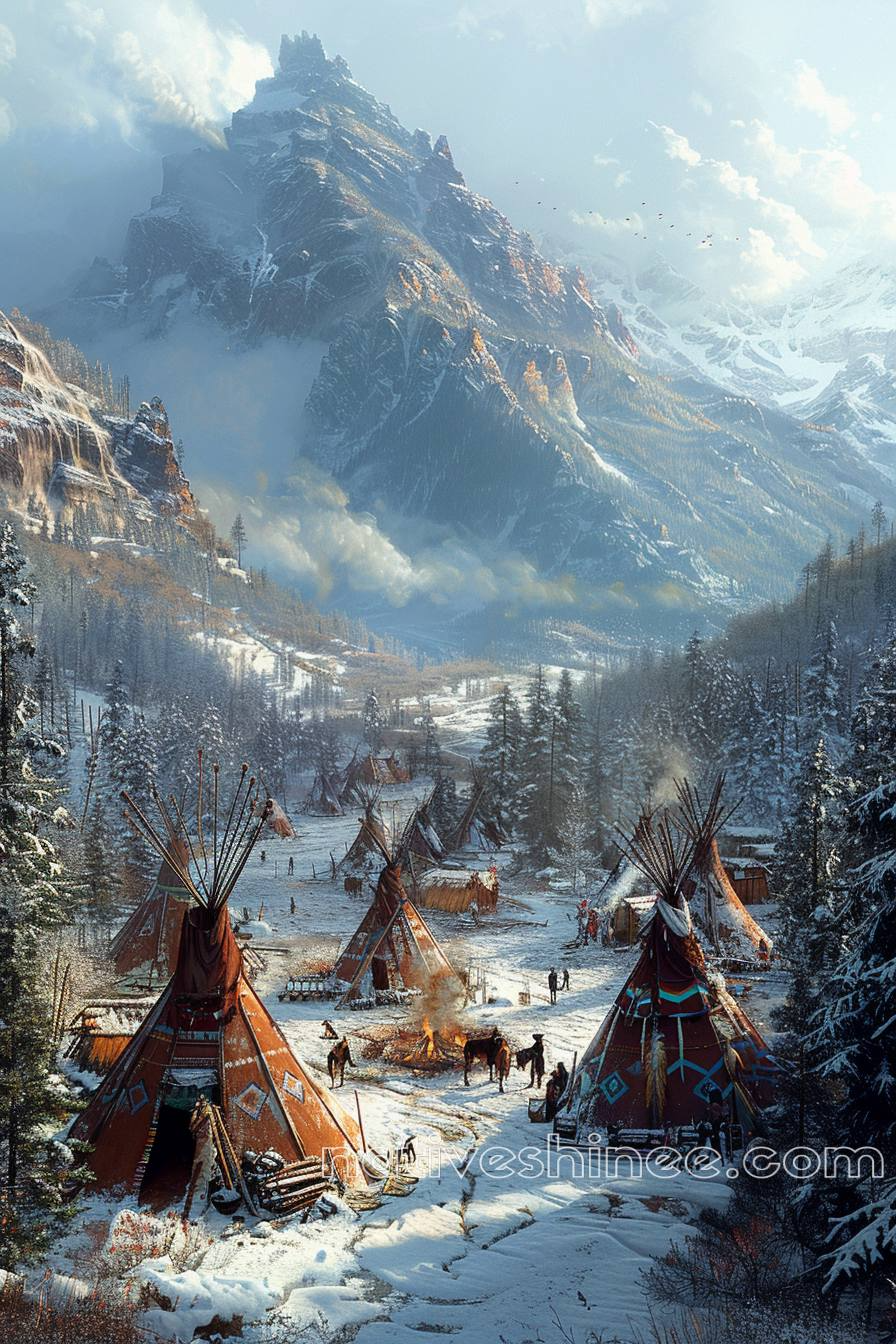 Life in a Native American Village Amidst the Majestic Winter Landscape Canvas