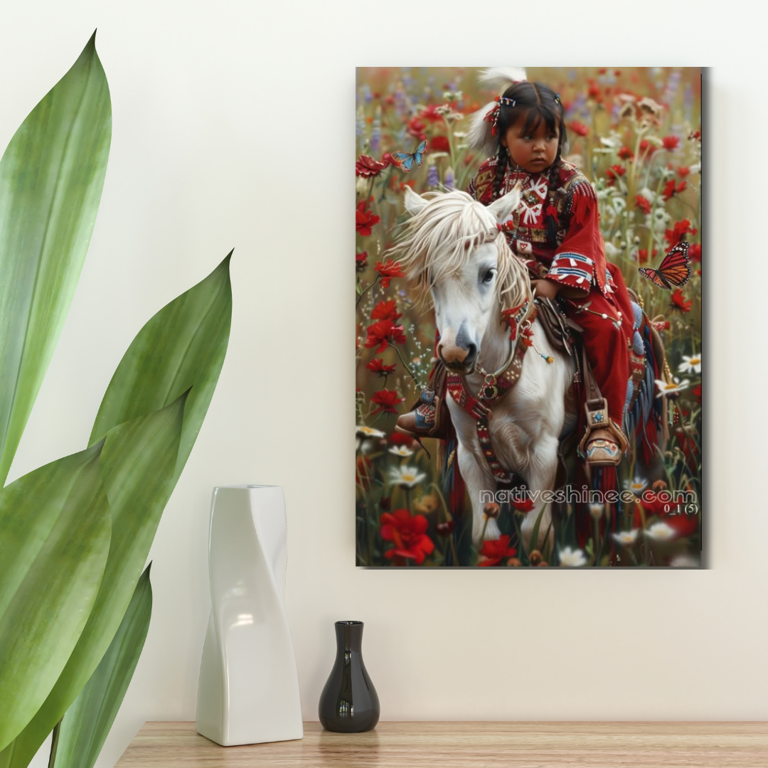 A young child dressed in vibrant red regalia rides a gentle white pony through a meadow brimming with red poppies and fluttering butterflies. The tender connection between the child, the horse, and the surrounding nature evokes a sense of purity and wonder. Little Rider of the Blossoms Native American Canvas celebrates the harmonious bond between heritage, innocence, and the beauty of the natural world.