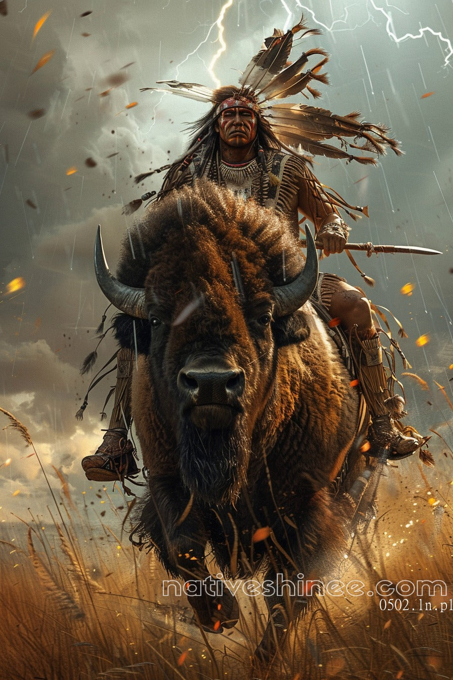 This dynamic canvas brings to life a Native American warrior riding a mighty buffalo across a storm-swept plain. The scene is charged with intensity, as lightning illuminates the dark sky, reflecting the power and determination of both rider and beast. The warrior, adorned in intricate feathers and beads, wields a spear with fierce resolve, embodying the warrior spirit in the face of nature’s fury. The wild storm around him amplifies the raw strength and unyielding spirit of the people who once roamed the land, as the thunder and lightning seem to echo their courageous legacy. This powerful image captures the essence of resilience, leadership, and the unbreakable bond between the Native American people and the natural world.