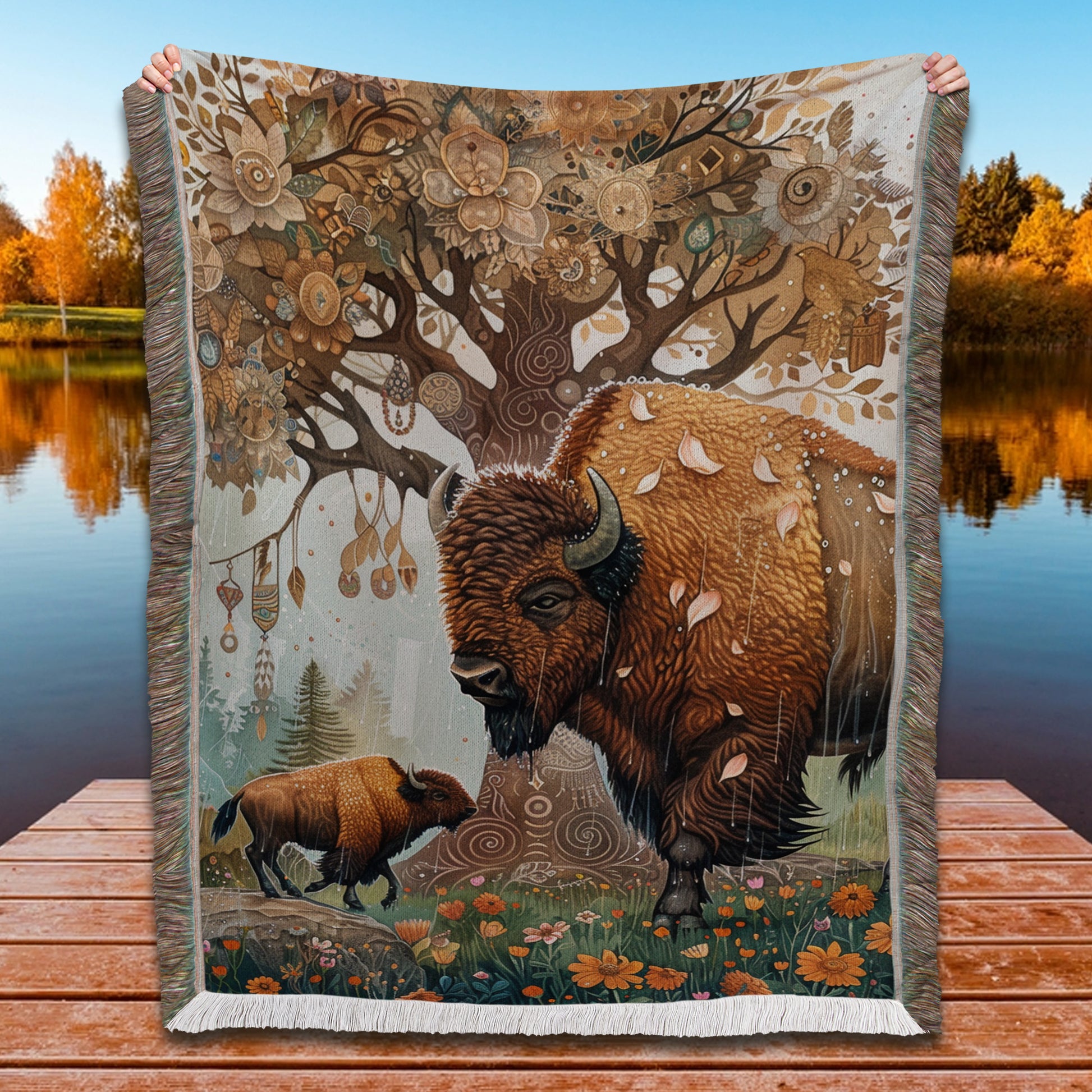 Step into the timeless beauty of the plains with our Meadow Buffalo Woven Blanket! This stunning throw features a buffalo and her calf standing in a golden meadow, with a traditional teepee in the background, set against a vibrant sky with cultural elements like beaded adornments. Perfect for those who admire the harmony of wildlife and Native heritage, this blanket adds a touch of rustic elegance to any space. Crafted with a soft, woven texture and finished with fringed edges, it’s ideal for cozying up on chilly evenings, draping over your couch, or using as a striking wall tapestry. Wrap yourself in the warm imagery of this buffalo meadow scene, and let its cultural charm inspire your cozy moments.