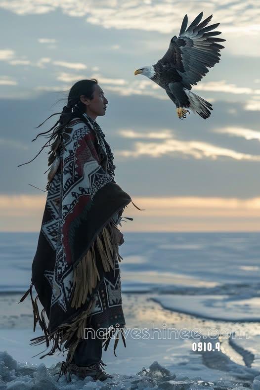 Messenger of the Dawn captures the profound harmony between a Native woman and her spiritual companion—an eagle soaring into the awakening sky. Wrapped in a traditional patterned blanket, she stands at the edge of a frozen shore, the first light of sunrise washing over her in tones of gold and silver. The eagle takes flight just as the day begins, symbolizing renewal, freedom, and divine connection. Her calm presence and the eagle’s powerful wings create a sense of sacred communication between earth and sky, a ritual of trust and reverence for life. This canvas embodies the strength and serenity of the feminine spirit intertwined with the forces of nature—grounded, wise, and free. Every brush of light and shadow speaks of ancient prayers carried by the wind, reminding us of the eternal dialogue between humanity and the natural world.