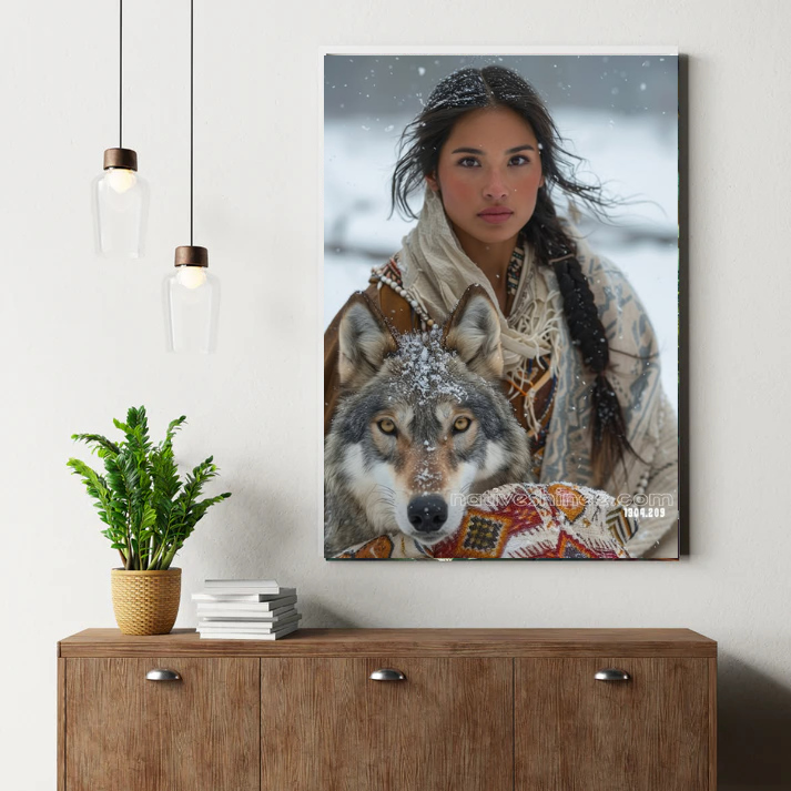 The canvas depicts a mysterious and ethereal scene of two figures standing amidst a fog-shrouded highland, dressed in traditional, intricately detailed attire adorned with feathers and beads. One figure holds a staff, peering into the misty expanse, while the other stands with a bow, their forms partially obscured by the swirling fog. The background features rugged, rolling peaks and sparse trees, their outlines softened by the haze, creating a sense of depth and quiet strength. The artwork is framed and displayed above a wooden cabinet, accompanied by a green plant and a stack of books, creating a warm and natural ambiance in the setting.