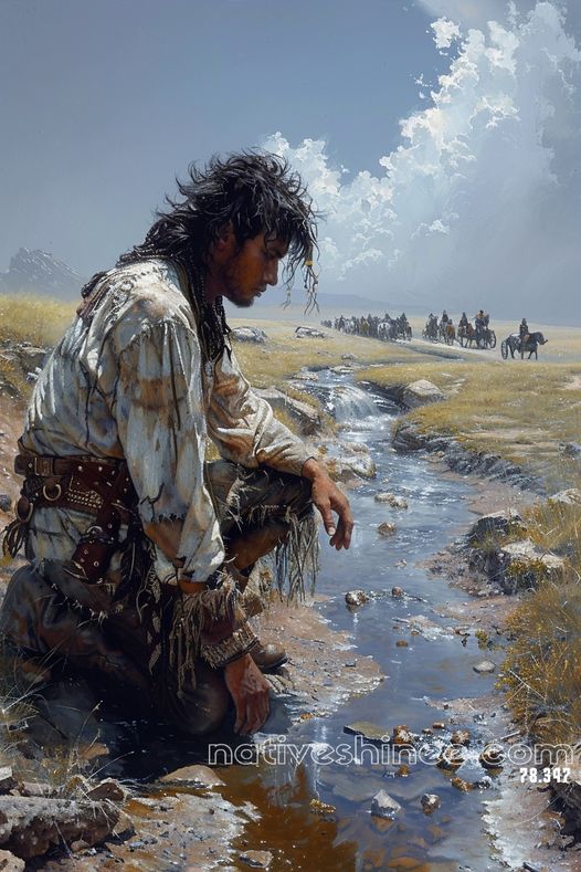 A lone man kneels by a narrow creek, his gaze fixed on the rippling water as though seeking solace or answers. His weathered clothing and intricate beadwork hint at a life of resilience and tradition. In the distance, a group on horseback and wagons traverse the open prairie, their journey unfolding under a vast, cloud-filled sky. The scene captures a poignant pause amid a journey, a quiet tribute to the enduring spirit and connection to the land that defines this timeless path.