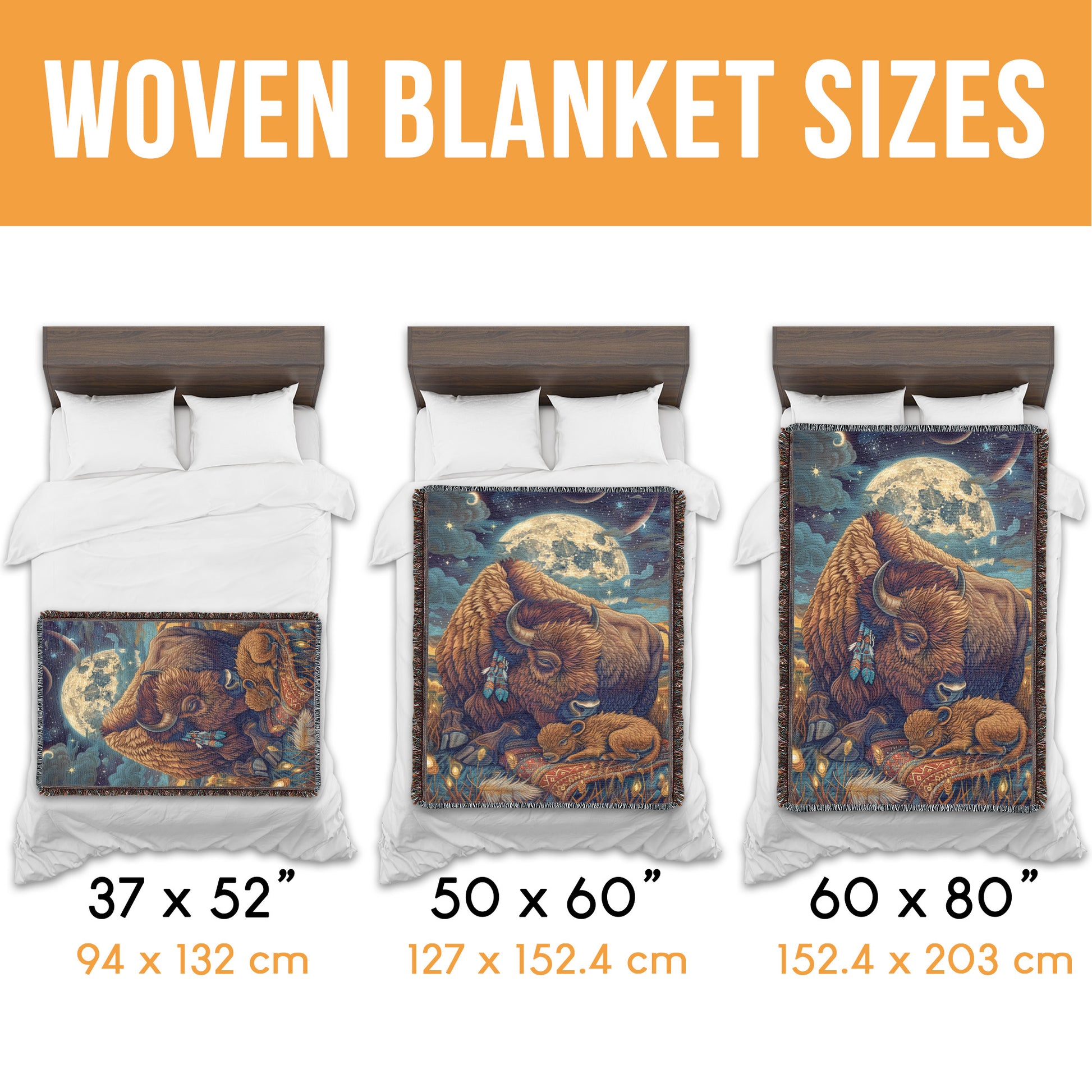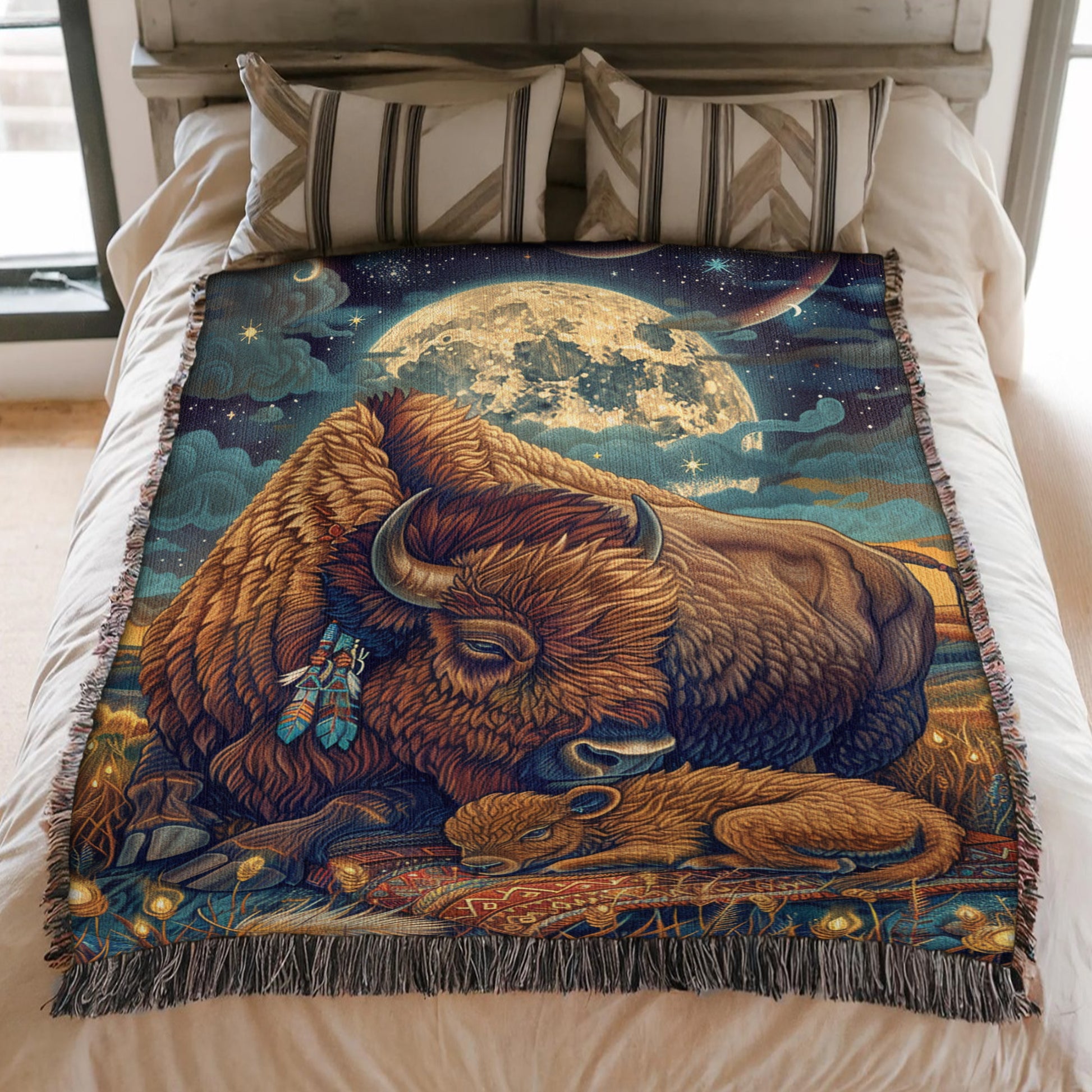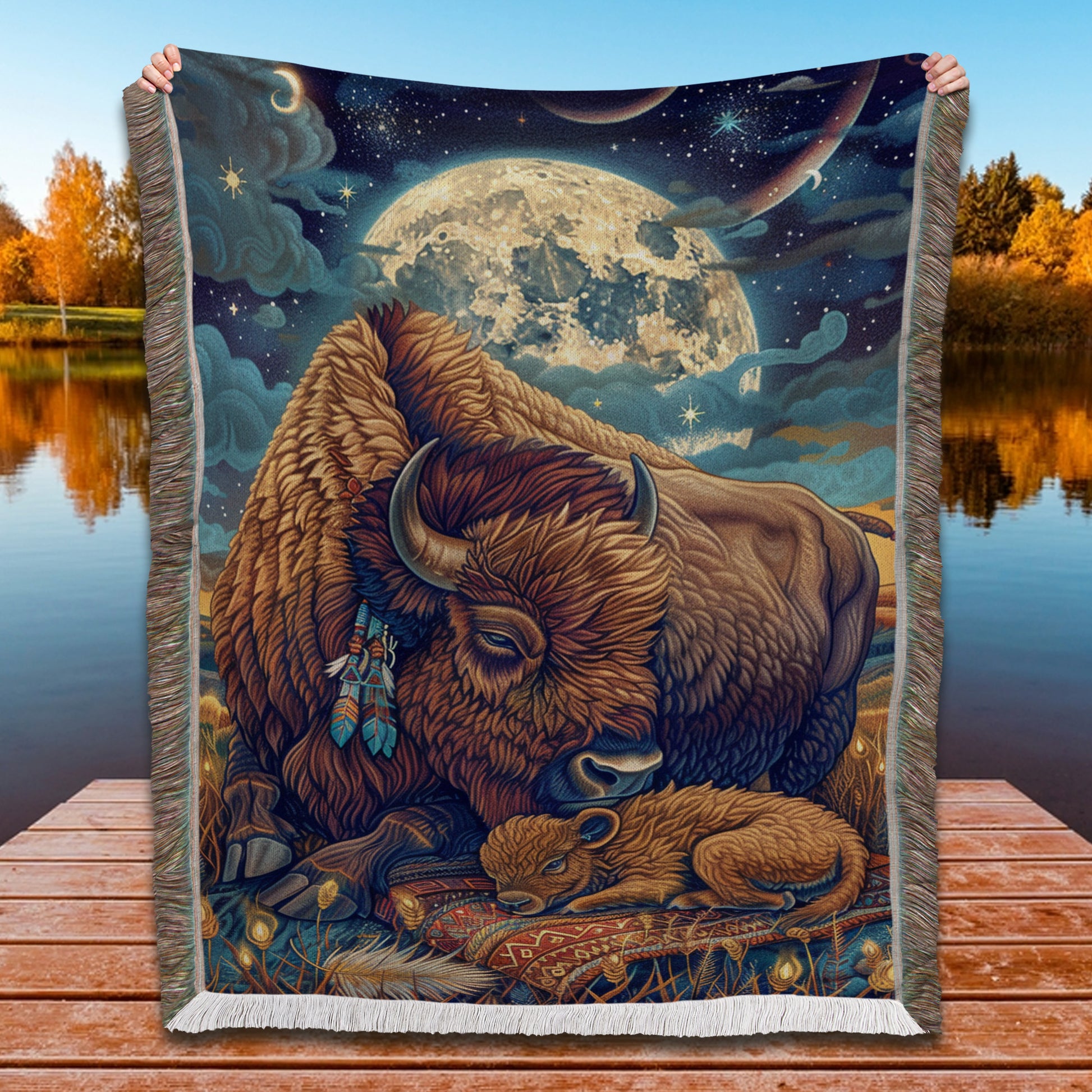 Embrace the magic of the night with our Moonlit Buffalo Woven Blanket! This enchanting throw features a majestic buffalo and her calf resting under a glowing full moon, surrounded by a starry sky with celestial elements, creating a mystical and serene scene. Perfect for those who cherish the beauty of wildlife and the tranquility of nature, this blanket adds a touch of cosmic elegance to any space. Crafted from 100% cotton and expertly woven for a soft, breathable, and durable finish, it’s ideal for cozying up on chilly evenings, draping over your couch, or displaying as a unique wall tapestry. The fringed edges enhance its rustic charm, making it a versatile piece for both decor and comfort. Wrap yourself in the serene beauty of this buffalo moonlit scene, and let its celestial glow inspire your cozy moments.