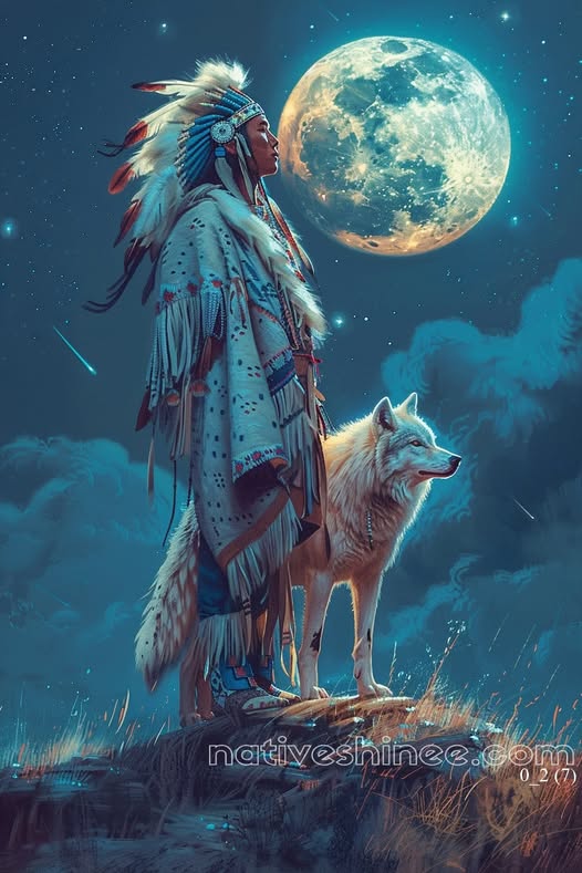 Beneath the radiant glow of a full moon, a dignified warrior stands alongside a majestic white wolf, embodying the unity between humanity and the spirit of the wild. The serene night sky, speckled with stars and falling meteors, forms a celestial backdrop that echoes timeless traditions and ancient wisdom. Draped in intricate regalia adorned with feathers, the figure gazes upward in a moment of reflection and harmony with nature. Moonlit Guardians: A Native American Canvas captures the profound connection to the natural and spiritual worlds, offering a vision of quiet strength and balance.