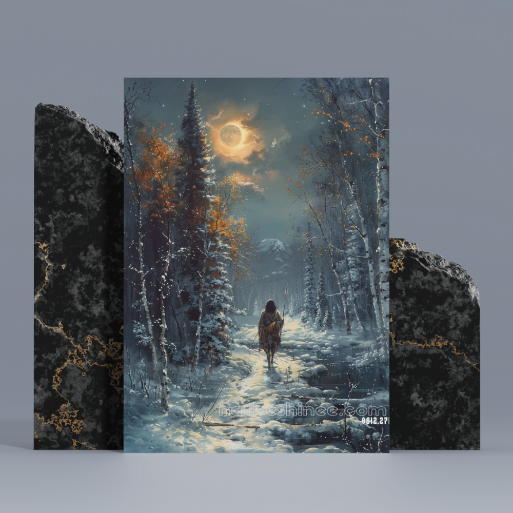This breathtaking Native American canvas captures a solitary warrior as he ventures through a winter forest illuminated by the full moon. Dressed in traditional attire, the figure walks with purpose, his spear in hand, traversing a snow-covered path that winds through towering trees. The moon’s ethereal light casts a gentle glow over the serene landscape, creating a sense of calm and reflection. The distant mountains and the quiet stillness of the scene embody strength, solitude, and a deep connection to nature. This piece is a tribute to the enduring spirit of Native American culture and the bond with the natural world
