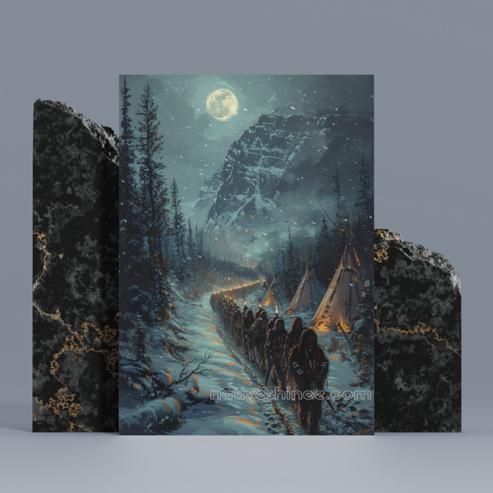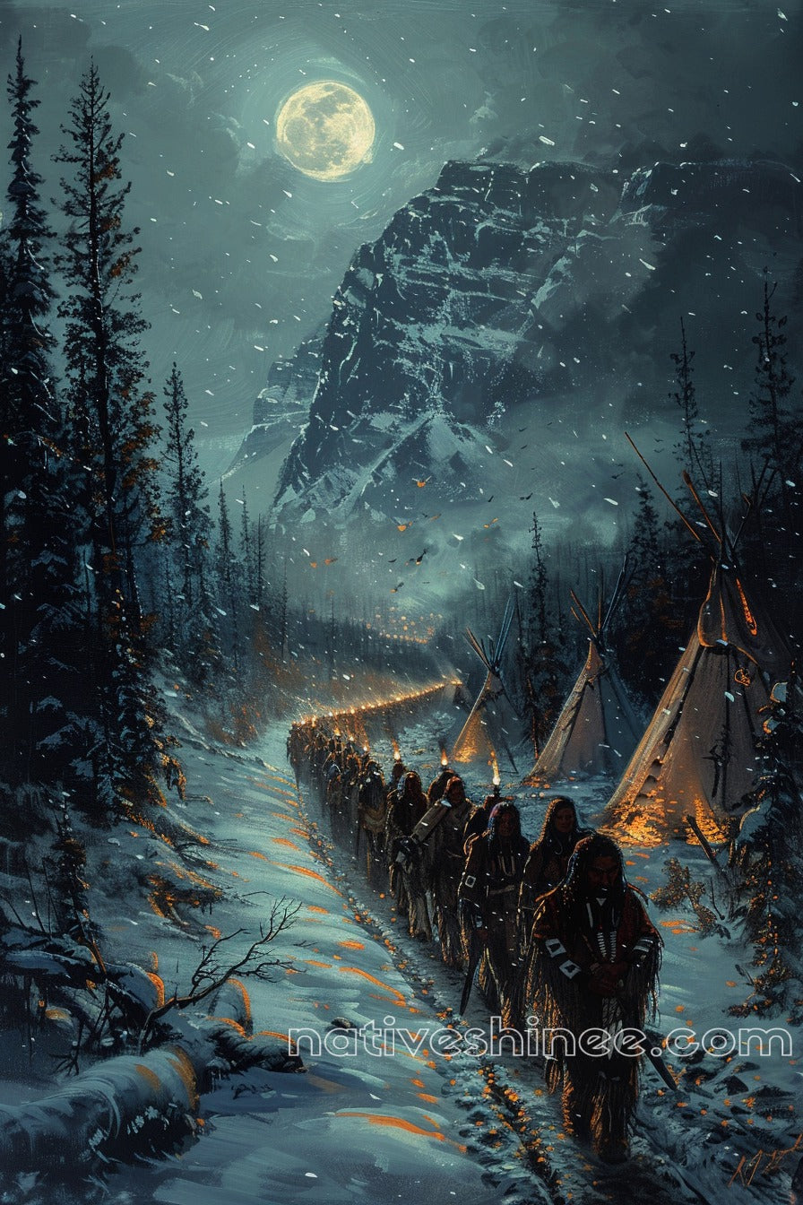 In the quiet glow of the full moon, a procession of Native American ancestors makes their way through the snowy wilderness, their path illuminated by torches that flicker against the cold night air. This stunning canvas captures the spiritual journey of these resilient people, their footsteps marking a sacred route through time. Teepees rise in the distance, standing as symbols of home and heritage. This piece evokes a profound sense of unity, strength, and reverence for the land.