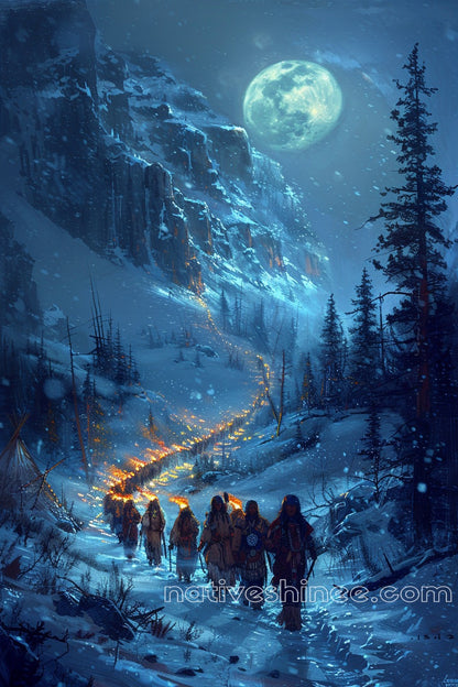 Under the full moon, a long line of Native Americans, their faces lit by torches, traverses a snow-covered path. The light of their flames contrasts with the cold, dark landscape, symbolizing strength, unity, and resilience in the face of adversity. This painting captures a profound moment of migration and survival, where each step forward reflects the journey of a people determined to preserve their spirit.