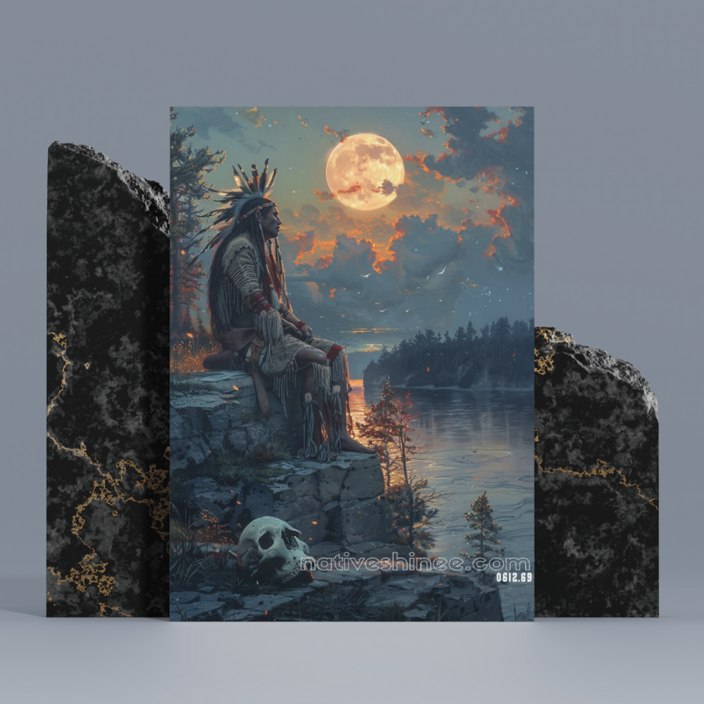 Under the brilliance of a full moon that illuminates the sky with an ethereal glow, a Native American figure sits in silent contemplation atop a rocky ledge overlooking a serene lake. The clouds burn with hues of orange and red, a reflection of ancient fires that once lit this land. Below, a weathered skull whispers stories of past struggles and enduring spirits. This poignant scene captures the timeless connection between human resilience, the sacred elements, and the mysteries of the natural world. A truly evocative Native American Canvas.