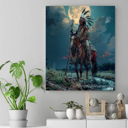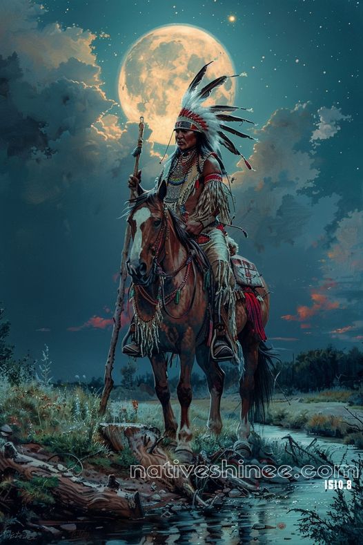 Beneath a glowing full moon, a proud Native American warrior sits atop his trusted steed, radiating strength and wisdom. Dressed in traditional regalia adorned with intricate beadwork and feathers, he holds a ceremonial staff that symbolizes his connection to the land and his ancestors. The tranquil stream at their feet reflects the celestial light, blending earth and sky in a harmonious balance. This breathtaking night scene captures the unity of tradition, nature, and spirituality, evoking a sense of timeless honor and peace.