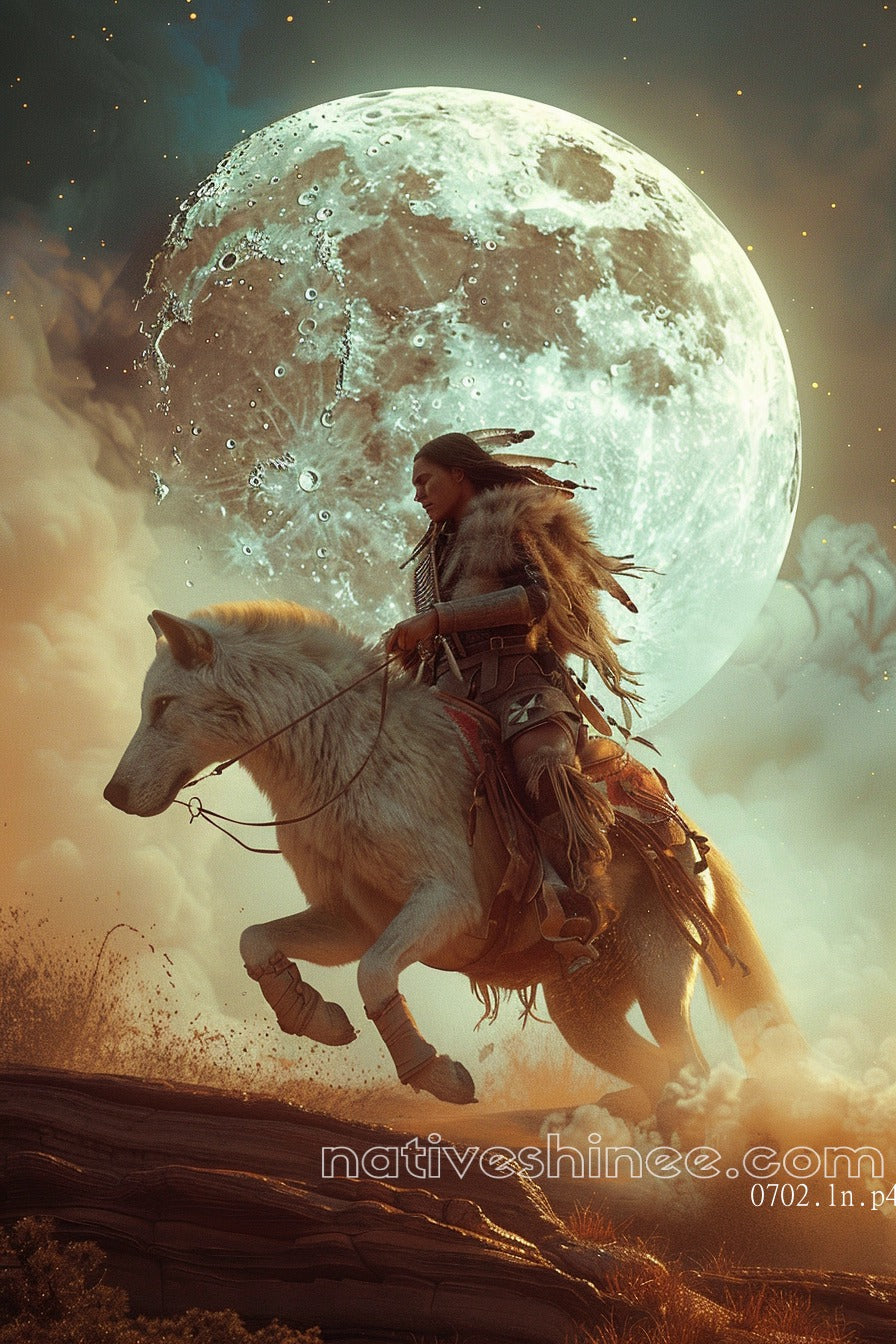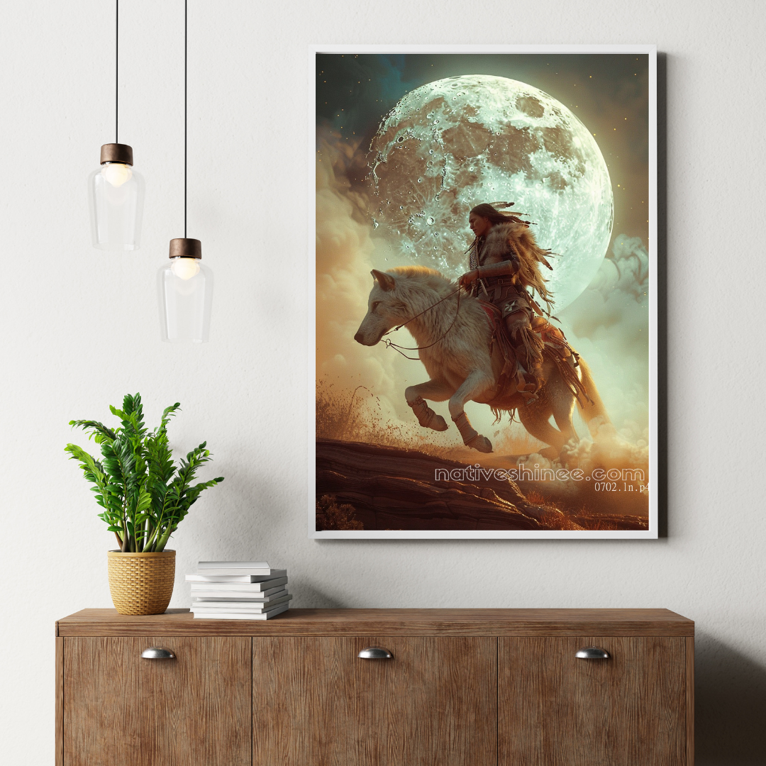 Ride under the glow of the full moon with this captivating canvas art, Moonlit Wolf Rider Native American Canvas. This powerful image depicts a Native American warrior riding a majestic white wolf, set against the mystical backdrop of a glowing moon. The warrior's detailed attire and the ethereal scene evoke the deep spiritual connection between the rider and the wolf, symbolizing strength, unity, and respect for nature. This artwork captures the essence of the warrior’s journey through both the physical and spiritual realms, making it a perfect addition to any collection that honors Native American traditions and the wild beauty of the earth. Ideal for those who appreciate mystical and empowering imagery, this piece brings the mysterious energy of the moon and the untamed spirit of the wolf into your home.