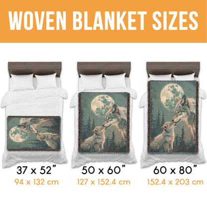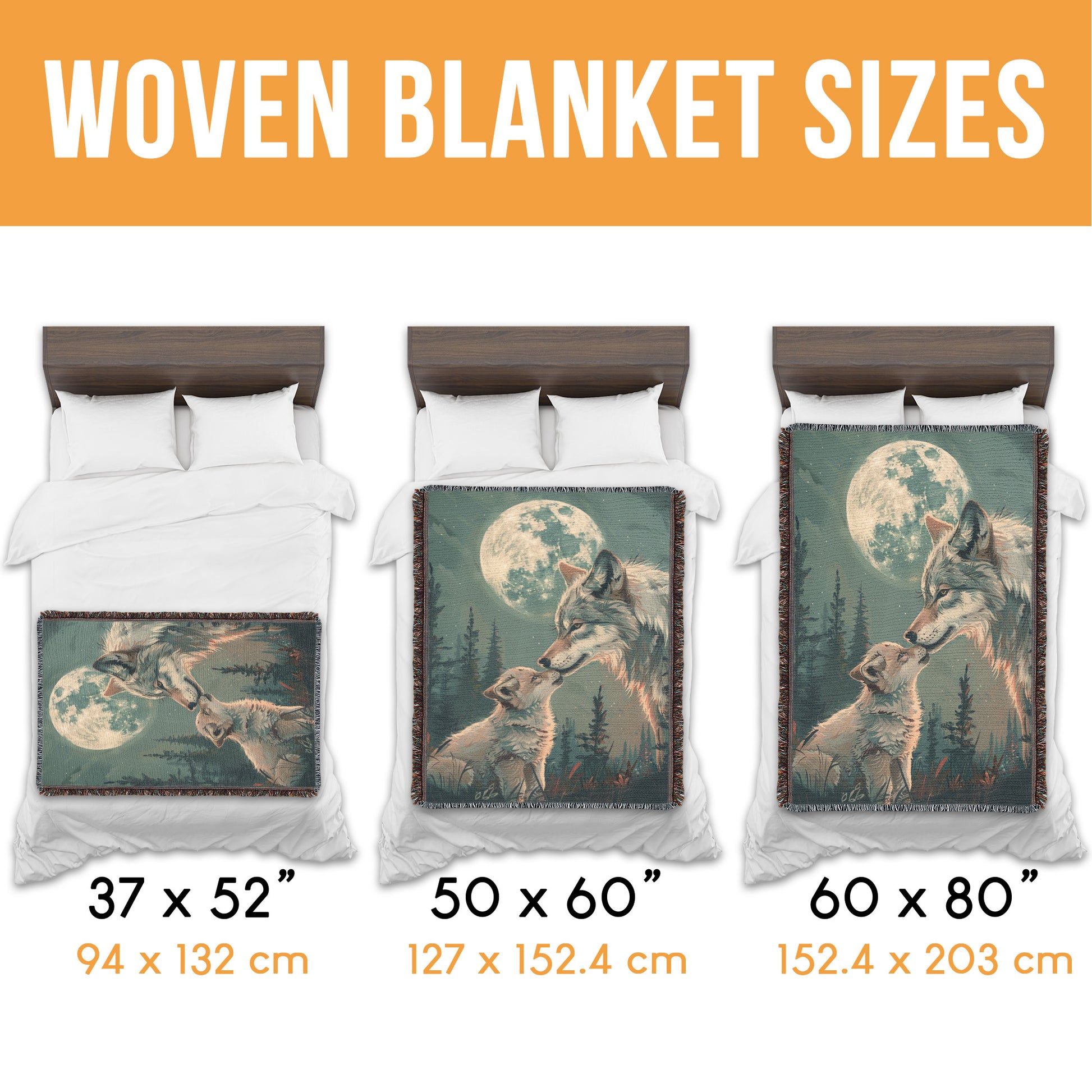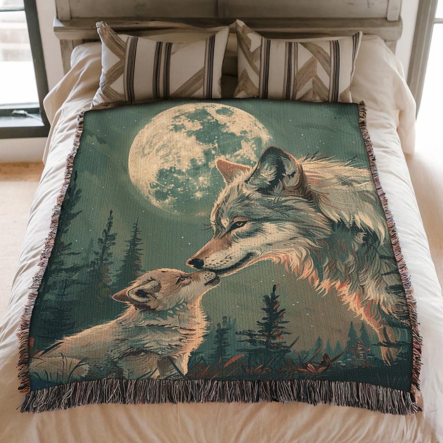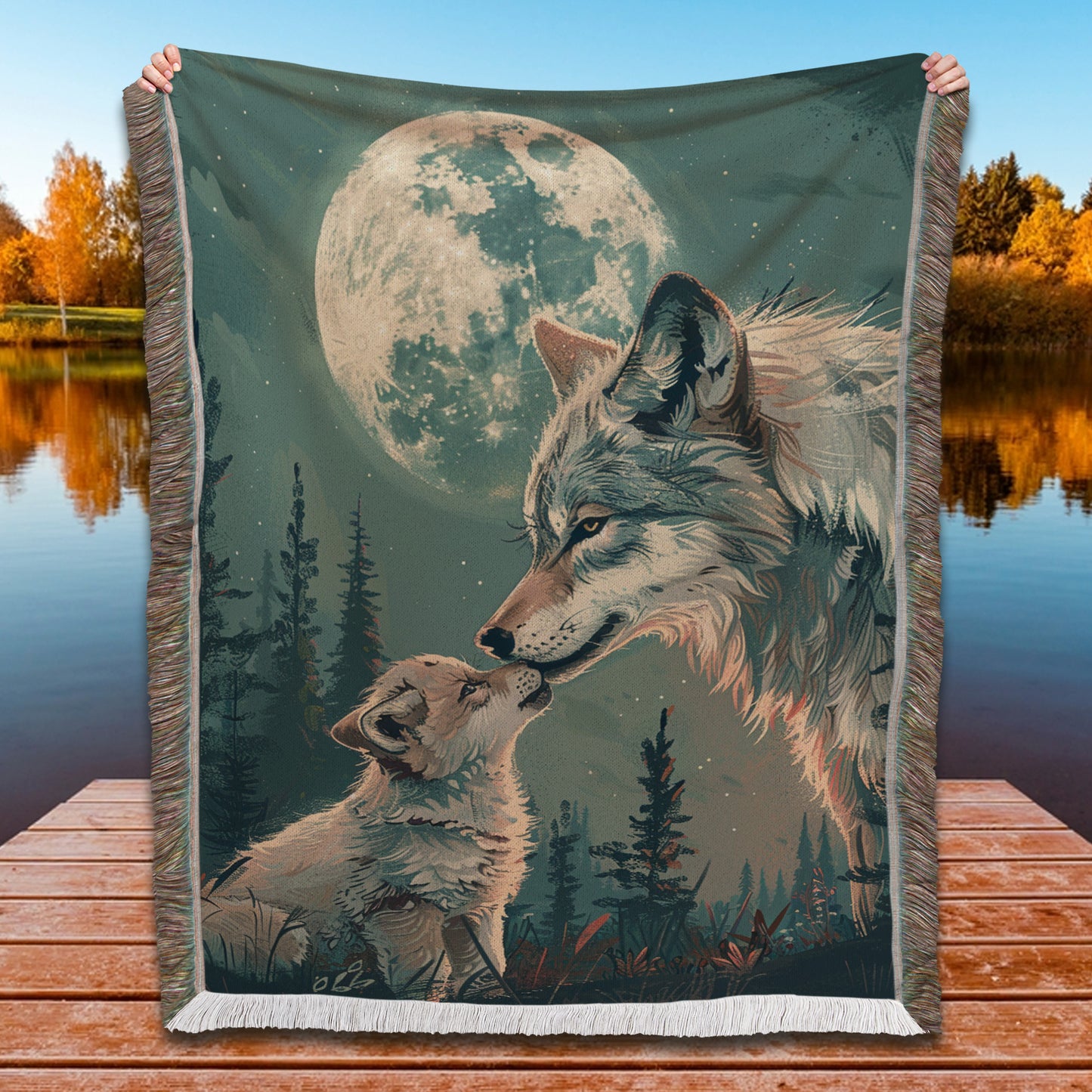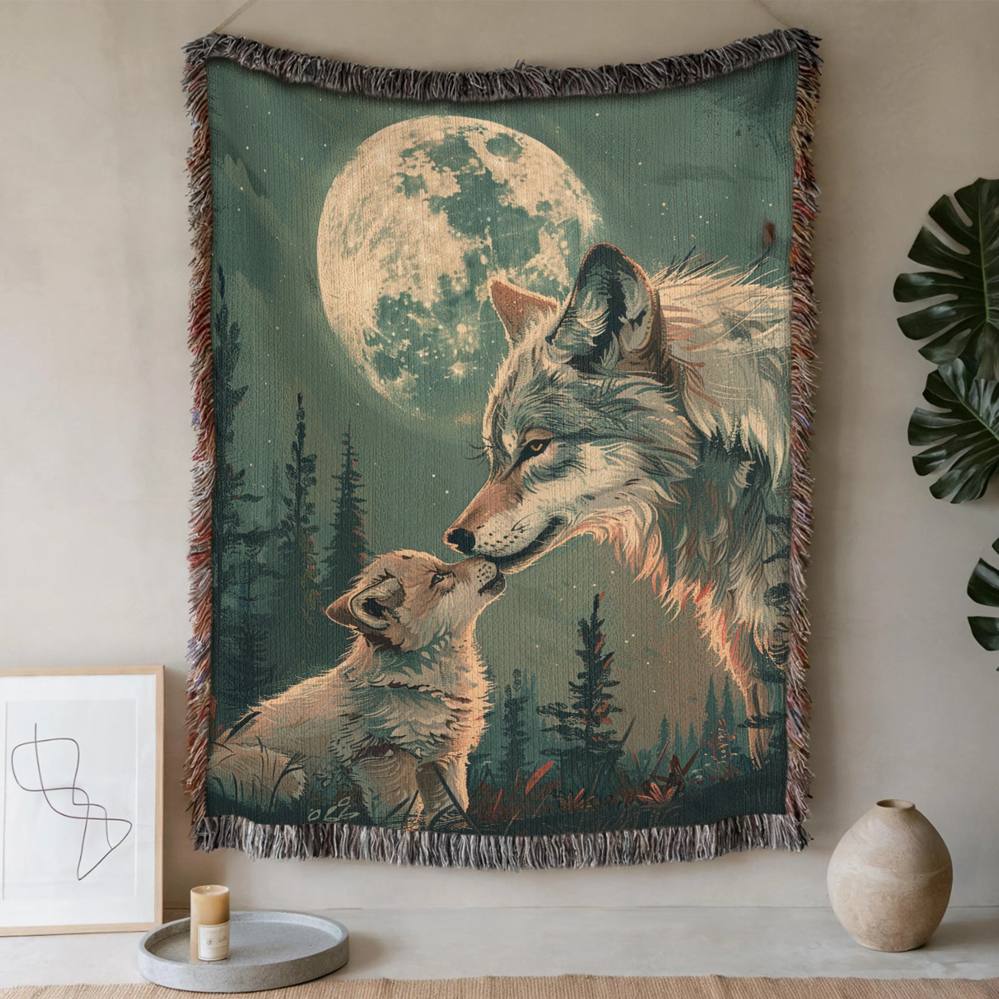 Unleash the spirit of the wild with our Moonlit Wolves Woven Blanket! This mesmerizing throw depicts a wolf and her pup sharing a tender moment under a glowing full moon, set against a starry forest backdrop that radiates a mystical, natural vibe. Perfect for those who adore the beauty of wildlife and the tranquility of the night, this blanket adds a touch of ethereal elegance to any space. Crafted from 100% cotton and expertly woven for a soft, breathable, and durable finish, it’s ideal for cozying up on chilly evenings, draping over your couch, or displaying as a unique wall tapestry. The fringed edges enhance its rustic charm, making it a versatile piece for both decor and comfort. Wrap yourself in the serene beauty of this wolf moonlit scene, and let its wild spirit inspire your cozy moments.