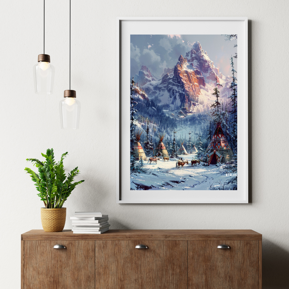 The image depicts a winter scene in a Native American village nestled among snow-covered mountains. Several tepees are pitched on a frozen lake, with horses grazing nearby. The village is surrounded by a dense forest of pine trees, and a majestic mountain peaks dominates the background. The overall impression is one of peace and tranquility, highlighting the harmony between the Native Americans and their natural surroundings.