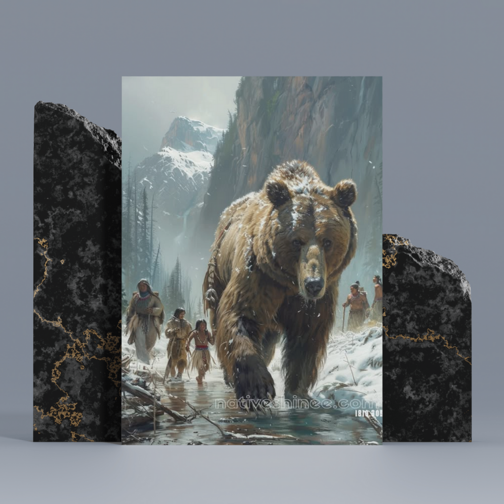 This awe-inspiring Native American Canvas portrays a group of Native American figures, accompanied by a massive bear, as they traverse a snowy landscape surrounded by towering mountains. The artwork beautifully depicts the powerful bond between the Native American people and nature, with the bear symbolizing strength and guidance. The crisp snow and the majestic wilderness evoke a sense of freedom and resilience. This stunning piece is perfect for those who honor the deep connection to the earth, wildlife, and the enduring legacy of Native American culture.