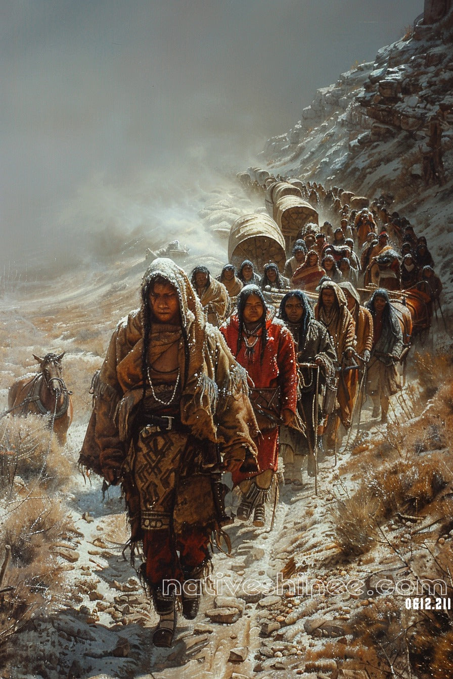This captivating canvas titled "Native American Trail of Perseverance" portrays a moving scene of determination and unity. A group of Native Americans, wrapped in warm traditional garments, travels through a harsh, snow-covered mountain pass, their faces reflecting strength and endurance. The detailed depiction of wagons and rugged terrain emphasizes the challenges faced on their journey, symbolizing perseverance in the face of adversity. Perfect for history enthusiasts and those who value cultural heritage, this artwork brings a striking narrative of resilience and community to any space, inspiring admiration and reflection.