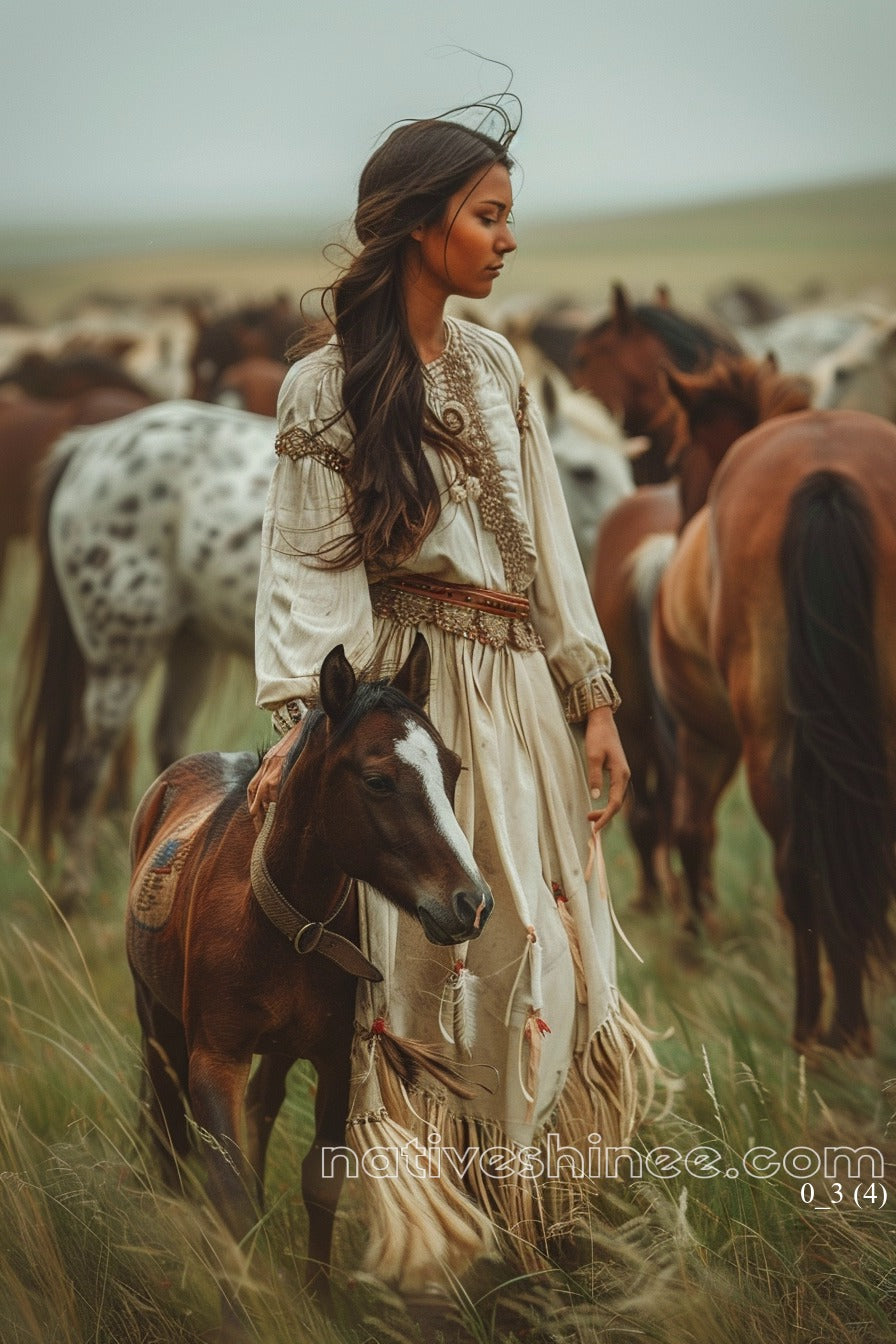 This beautiful Native American canvas art depicts a woman standing in a serene landscape, guiding a horse among a herd. Her flowing white dress, adorned with intricate beadwork and feathers, reflects the peaceful connection between her and the natural world. The horses in the background and the wind gently tousling her hair create a dynamic yet tranquil scene, symbolizing the bond between Native American culture and the wilderness. Ideal for those who appreciate Native American heritage and the majesty of horses, this artwork brings timeless beauty to any space.