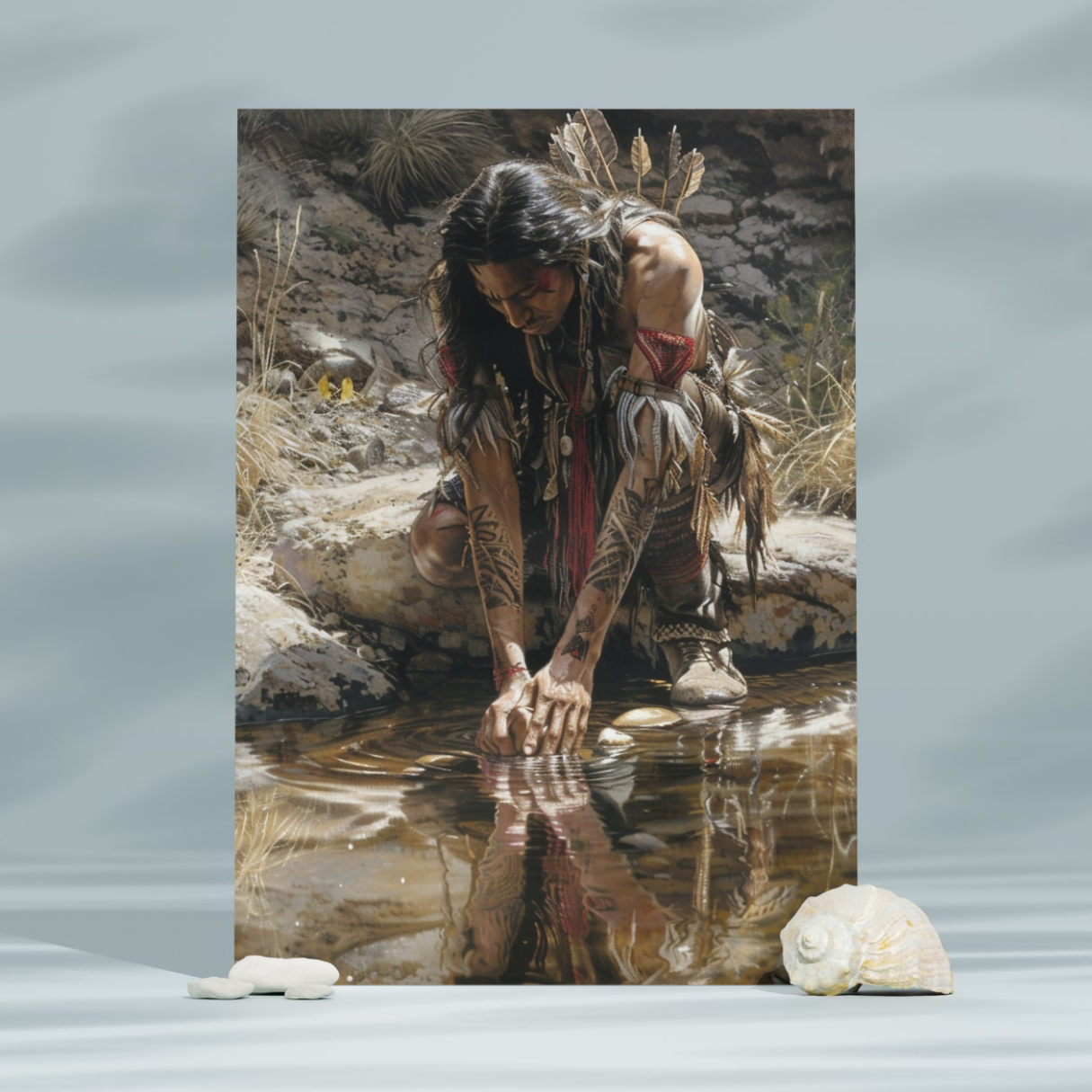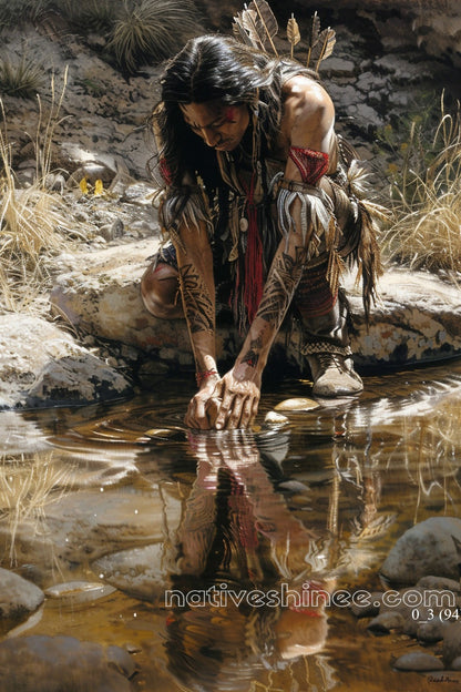 The Path of Strength Native American Canvas captures the essence of resilience, unity, and the natural flow of life. Featuring a powerful waterfall and a strong man standing in quiet strength, this artwork reflects the unyielding yet harmonious nature of those who walk their own path while remaining connected to the earth. The waterfall, with its unstoppable force, mirrors the determination and clarity of purpose found in a strong spirit. Meanwhile, the surrounding landscape of lush forests, flowing rivers, and playful children speaks to the unity of life and the precious moments of childhood that shape our journey.