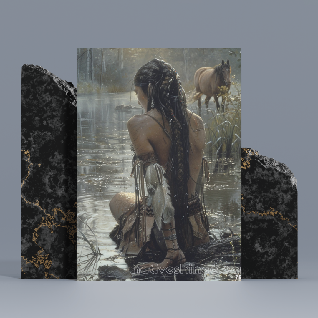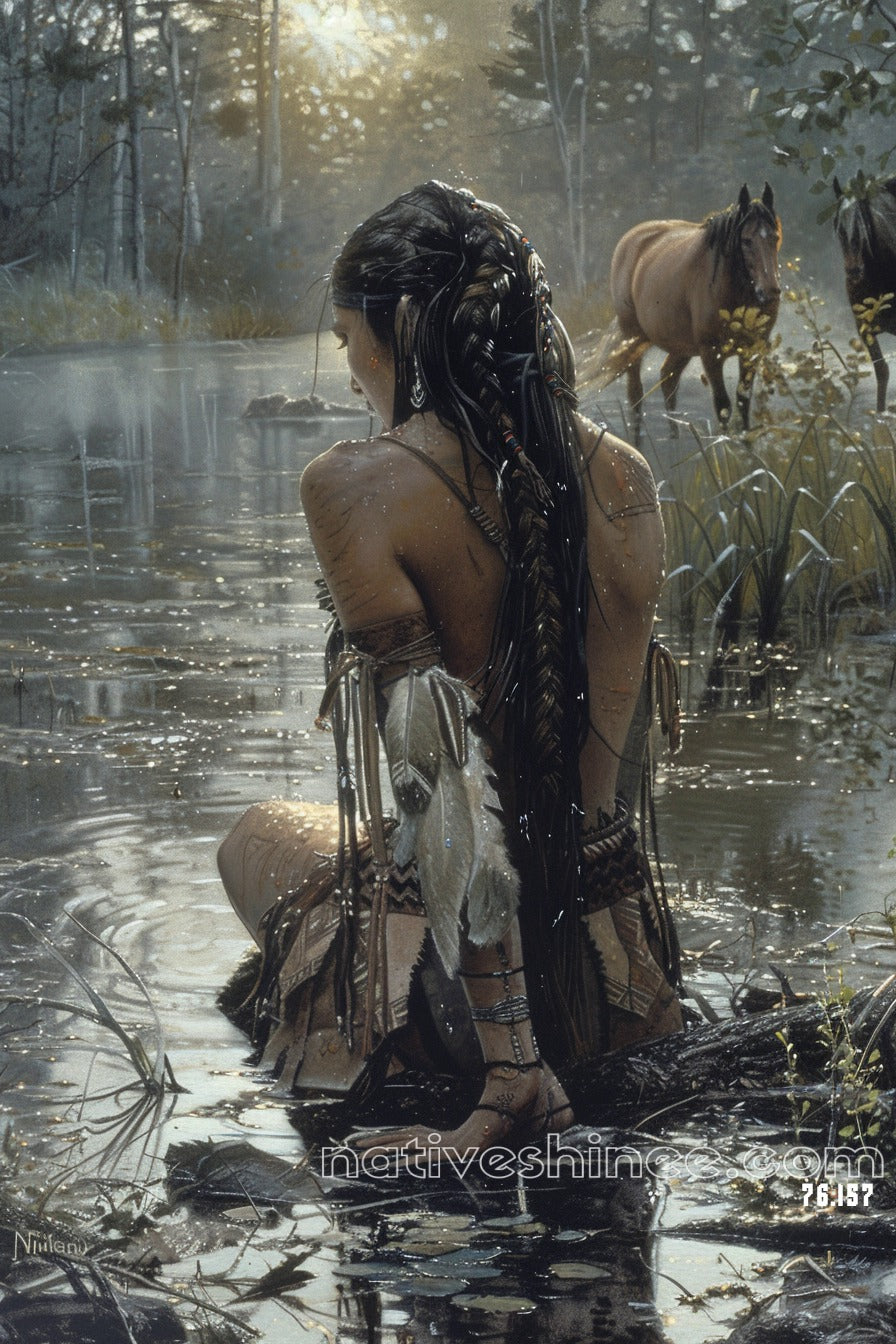 The Quiet Currents canvas captures a serene and powerful moment of connection between nature and spirit. A beautiful Native American woman with long black braided hair sits gracefully in the water, surrounded by horses and the peaceful embrace of towering trees. The rustic, naturalistic rendering evokes a sense of harmony with the earth, while the forestpunk aesthetic adds a modern, yet timeless touch. The scene flows with calmness and strength, reflecting the quiet wisdom that comes from nature’s stillness. This canvas invites you to pause and reflect, feeling the currents of the earth’s ancient wisdom flow through you.