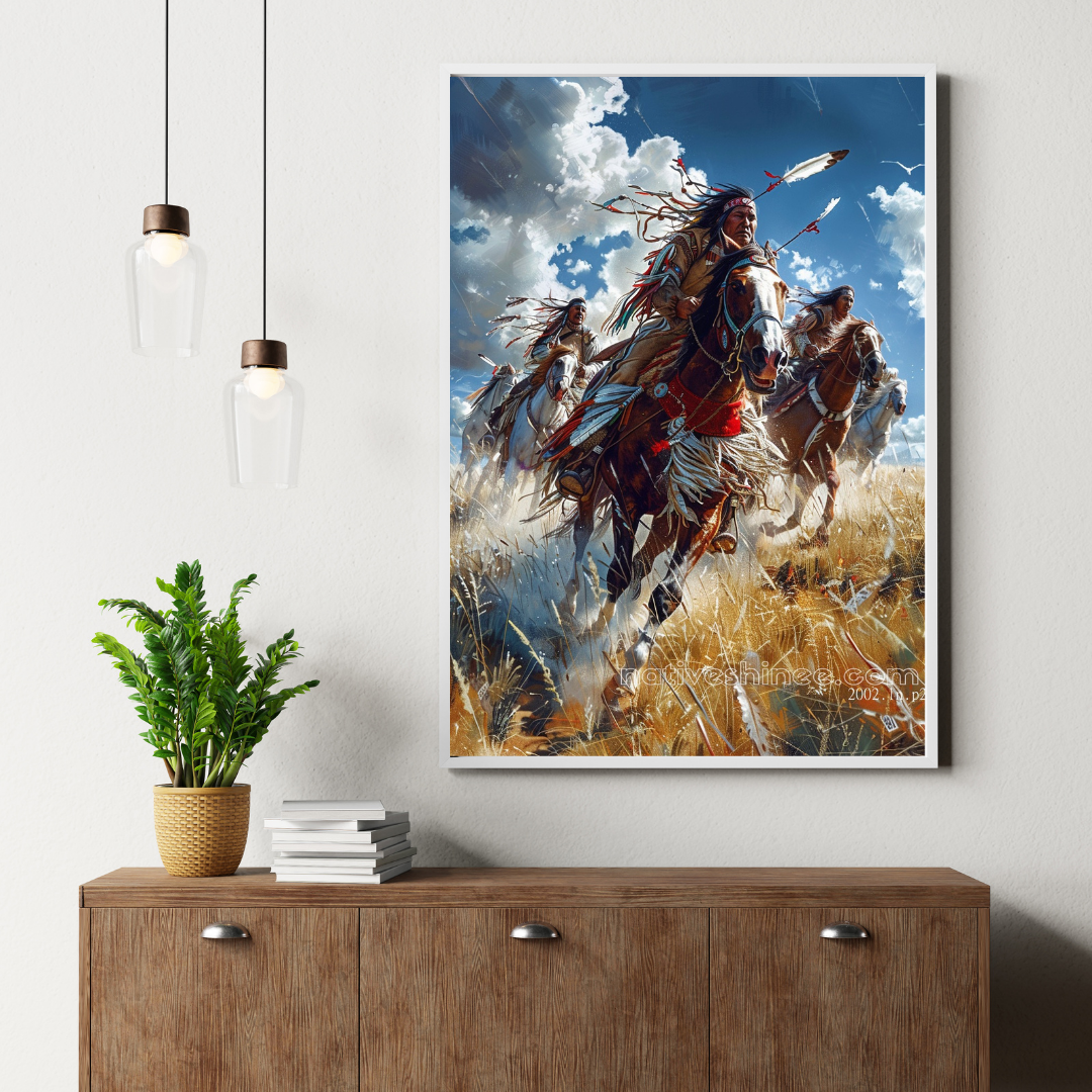The image captures a dramatic and energetic scene where a group of Native American riders gallop through an open field, their horses kicking up dust beneath them. The riders are adorned in traditional attire, featuring leather fringes, beaded jewelry, and feathered headdresses that symbolize their culture and connection to the land. The wind whips through their hair as they ride at full speed under a brilliant blue sky, with scattered clouds enhancing the sense of motion. Feathers from their headdresses trail behind them like arrows in flight, adding a sense of freedom and power to the moment. The golden grasses of the plains stretch out before them, highlighting their deep bond with the earth.