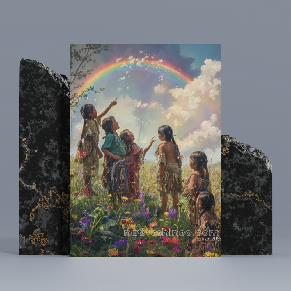 In a lively, flower-strewn meadow, a group of young children in traditional regalia looks to the sky with amazement as a brilliant rainbow arcs overhead. Their delighted expressions and shared laughter reflect a spirit of wonder and unity, capturing the boundless hope carried on every color of the rainbow