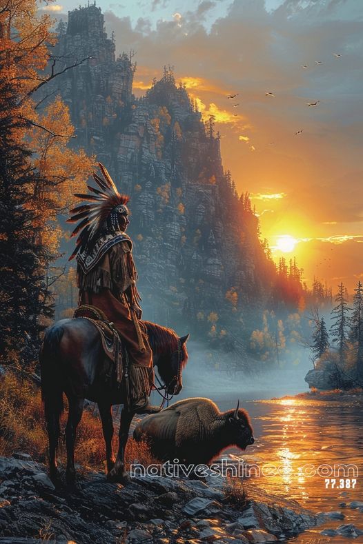 An Indigenous leader adorned in traditional regalia sits astride his horse, accompanied by a grazing bison, as they pause by the riverside. The golden hues of a setting sun illuminate the cliffs and forested mountains in the background, casting a serene glow over the tranquil water. The scene captures a moment of reflection, where nature and spirit unite, symbolizing the enduring connection between the land and its people. A timeless tribute to the harmony of life and the beauty of the natural world.