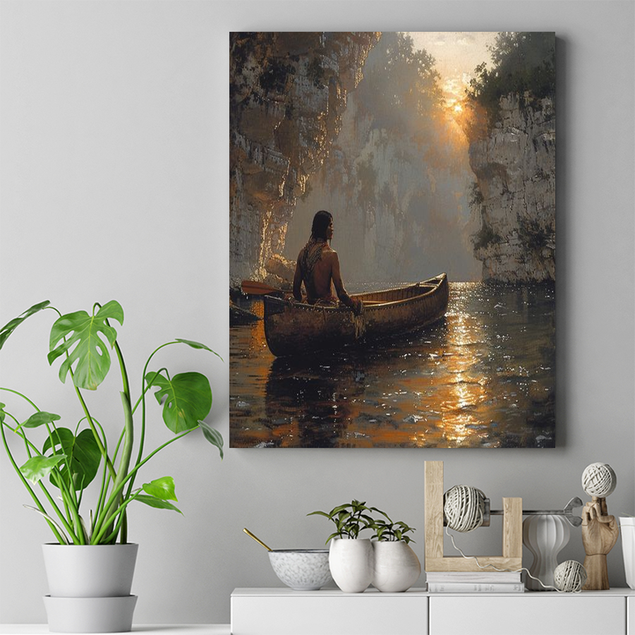 Immerse yourself in tranquility with the Reflections on the River Native American Canvas. This serene artwork features a Native American figure by a calm river, their reflection shimmering on the water, symbolizing introspection, harmony, and a deep connection to the natural world. The gentle flow of the river and the surrounding landscape evoke peace and timeless tradition. Crafted with premium-quality materials, this canvas adds elegance and cultural depth to any space. Perfect for those who cherish Native heritage and the quiet beauty of nature, it’s a timeless tribute to the flowing journey of life and self-discovery.