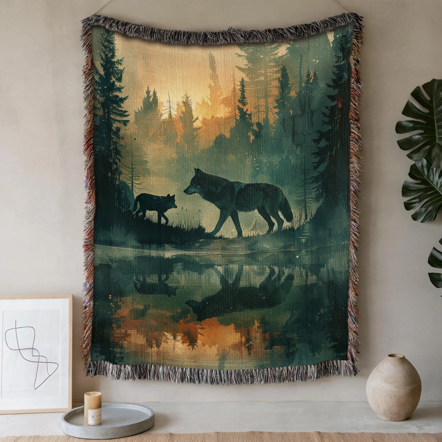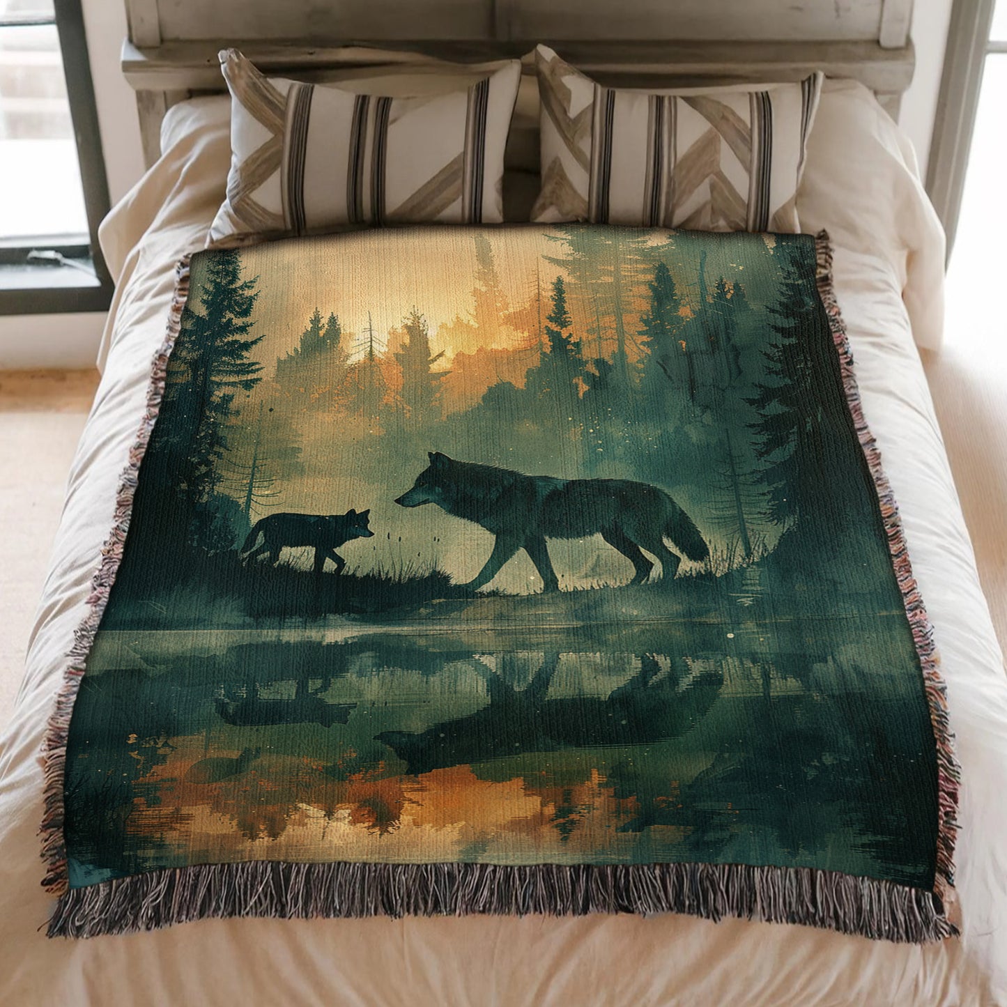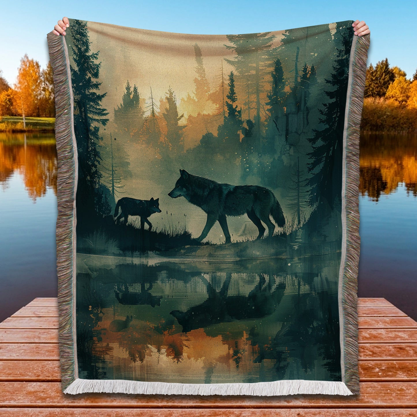 Dive into the tranquility of nature with our Reflective Wolf Lake Woven Blanket! This evocative throw captures two wolves walking through a reflective lake at twilight, with a misty forest and glowing sky creating a serene and mystical atmosphere. Perfect for those who love the elegance of wildlife and the calmness of natural landscapes, this blanket adds a touch of reflective beauty to any space. Crafted from 100% cotton and expertly woven for a soft, breathable, and durable finish, it’s ideal for cozying up on chilly evenings, draping over your couch, or displaying as a unique wall tapestry. The fringed edges enhance its rustic charm, making it a versatile piece for both decor and comfort. Wrap yourself in the peaceful imagery of this wolf lake scene, and let its reflective serenity inspire your cozy moments.