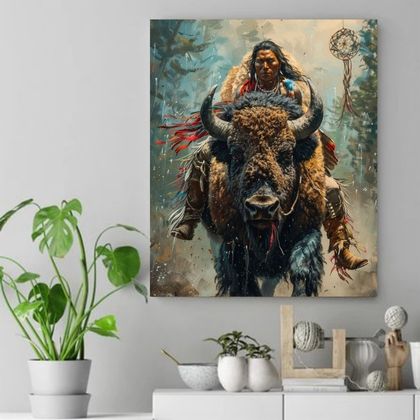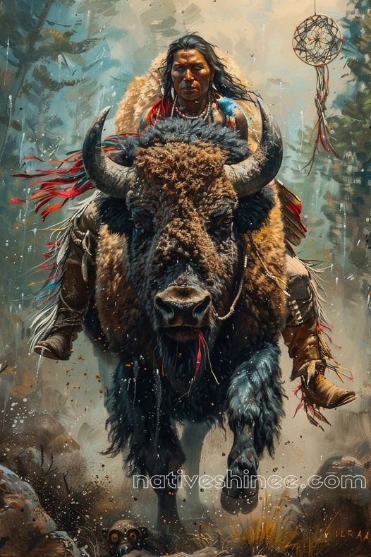 This dynamic image captures the powerful bond between the Native American warrior and the iconic bison. The warrior, adorned in traditional attire with flowing red tassels, rides atop the mighty bison as they charge through a forested terrain, exuding strength, speed, and unbreakable spirit. A dreamcatcher hangs in the background, adding a spiritual element to the scene. The combination of movement and symbolism reflects a deep connection to nature, embodying themes of courage, leadership, and harmony with the sacred bison, a revered animal in Native American culture.