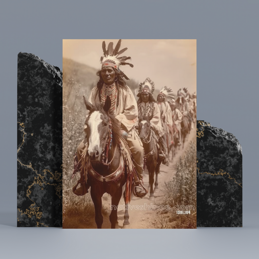 Riders of the Spirit Path depicts a powerful scene of Native American warriors riding through the untamed lands of their ancestors. Their majestic headdresses, adorned with feathers, and detailed beadwork tell stories of strength and tradition. As they ride in unison, the rhythm of their journey mirrors the deep connection to the earth beneath their horses' hooves. The warm golden tones of the photo evoke the timelessness of their path, capturing a moment of pride, unity, and reverence for the land they protect. This canvas speaks of heritage, honor, and the enduring legacy of those who once roamed free.