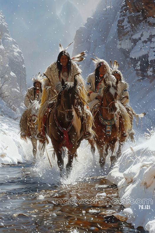 Three Native American warriors ride confidently through the snow-covered landscape, their horses splashing through a shallow stream. Wrapped in fur-lined garments, they embody the strength and resilience needed to traverse the harsh winter terrain. The towering cliffs around them reflect the light of the snow, creating a breathtaking scene of natural beauty and endurance. Each warrior represents the spirit of bravery, leading with purpose and connection to the land, as they make their way through this majestic yet challenging passage.