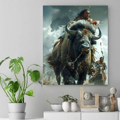 This dynamic canvas illustrates the powerful image of a Native American warrior riding atop a majestic buffalo, charging through the wilderness with untamed force. The vibrant energy of the scene, with dust swirling and the warrior's feathers flying in the wind, encapsulates the spirit of resilience, strength, and harmony with nature. The stormy clouds in the background and the warrior’s determined expression highlight the intensity of the moment, paying homage to the deep connection between Native people and the buffalo, a revered symbol of survival and abundance.