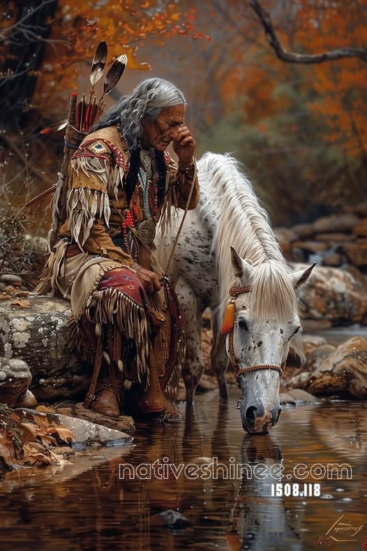 The canvas portrays a poignant scene of a figure dressed in traditional, fringed attire adorned with beads and feathers, sitting thoughtfully by a shallow stream. The individual gently touches their face, exuding a sense of contemplation, while a white horse with a spotted coat drinks from the water beside them. The background features a lush, autumnal forest with vibrant orange and yellow leaves, framed by rocky banks and a clear sky. The artwork is framed and displayed above a wooden cabinet, accompanied by a green plant and a stack of books, creating a warm and natural ambiance in the setting.
