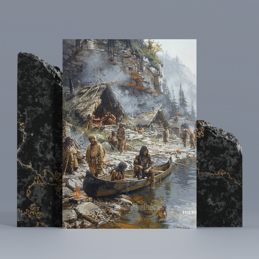 Set against a rugged cliffside, this captivating scene portrays a Native American riverside community engaged in their daily lives. Smoke from cooking fires mingles with the crisp mountain air as families gather near their rustic shelters. A canoe rests at the water's edge, with two individuals conversing while another tends to the canoe's interior. A child joyfully splashes in the clear waters, embodying the carefree spirit of youth. This canvas beautifully encapsulates the symbiotic relationship between the people and their natural environment, illustrating a lifestyle rooted in connection, resourcefulness, and unity.