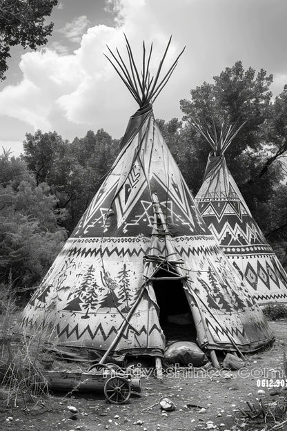 This poignant black-and-white photograph captures the quiet resilience of Native American life, symbolized through the iconic tipi. The intricate patterns on the canvas tell a story of tradition, culture, and the deep connection with nature. The towering peaks of the tipi rise toward the sky, their peaks reaching toward the heavens, while the structure stands firm, rooted in the earth below. The weathered yet strong wooden poles provide support to the shelter, which is adorned with hand-painted geometric designs and trees, signifying the harmony between people and nature.