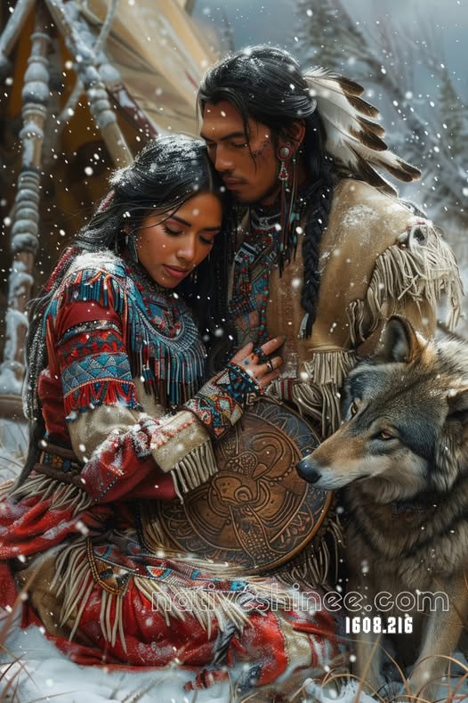 Sacred Bond portrays an intimate moment between a Native couple, enveloped in a quiet snowfall, symbolizing love, unity, and their connection to both each other and the earth. The woman, draped in traditional attire, holds a drum — a sacred object that connects her to the spiritual world. The man, in a similar state of reverence, gently touches her hand, a gesture of deep respect and love. Beside them, a wolf stands as both a protector and a spiritual guide, representing the Native belief in the interconnectedness of all living things. The backdrop of snow and the tipis represents the harsh yet beautiful natural world they endure and cherish. Together, the figures embody strength, tradition, and the preservation of culture, with their bond representing the resilience of their people and the unity they share with nature.