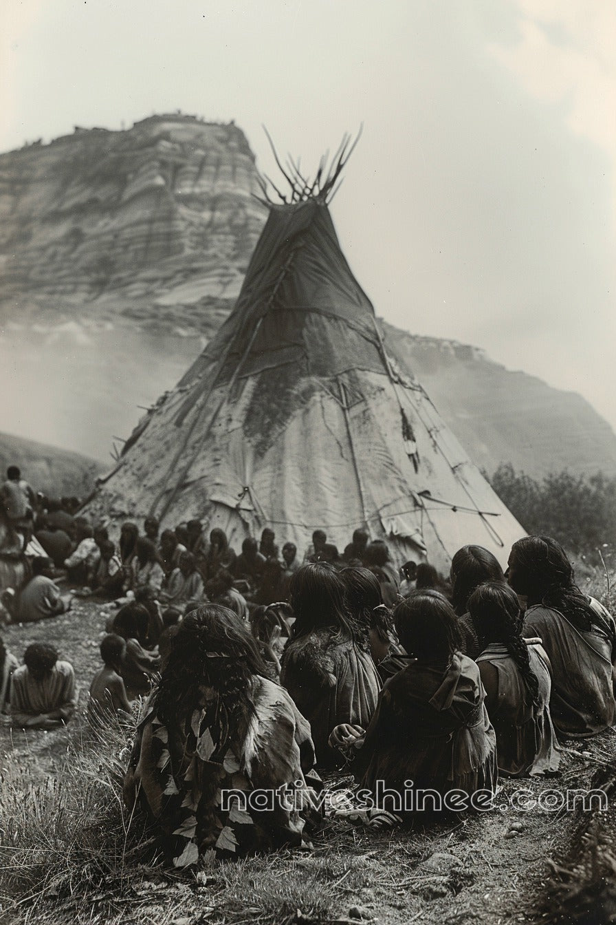 A powerful depiction of unity and tradition, this canvas captures the essence of Native American culture through a sacred gathering around the teepee. The image evokes a sense of community, connection, and respect for the land. A timeless representation of the deep roots and wisdom of the indigenous people, this canvas would make a meaningful addition to any space, honoring the spirit of the Native American way of life.