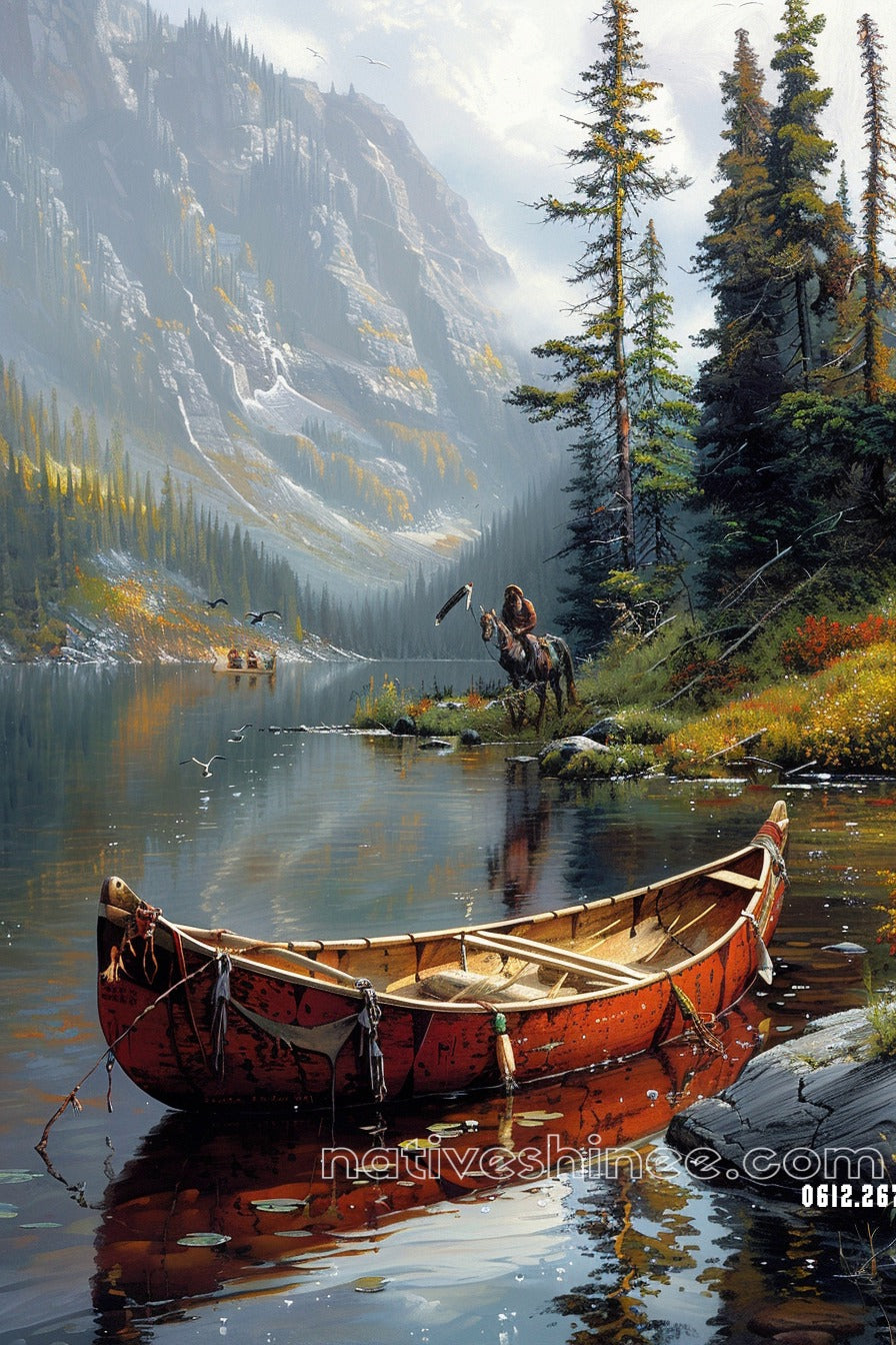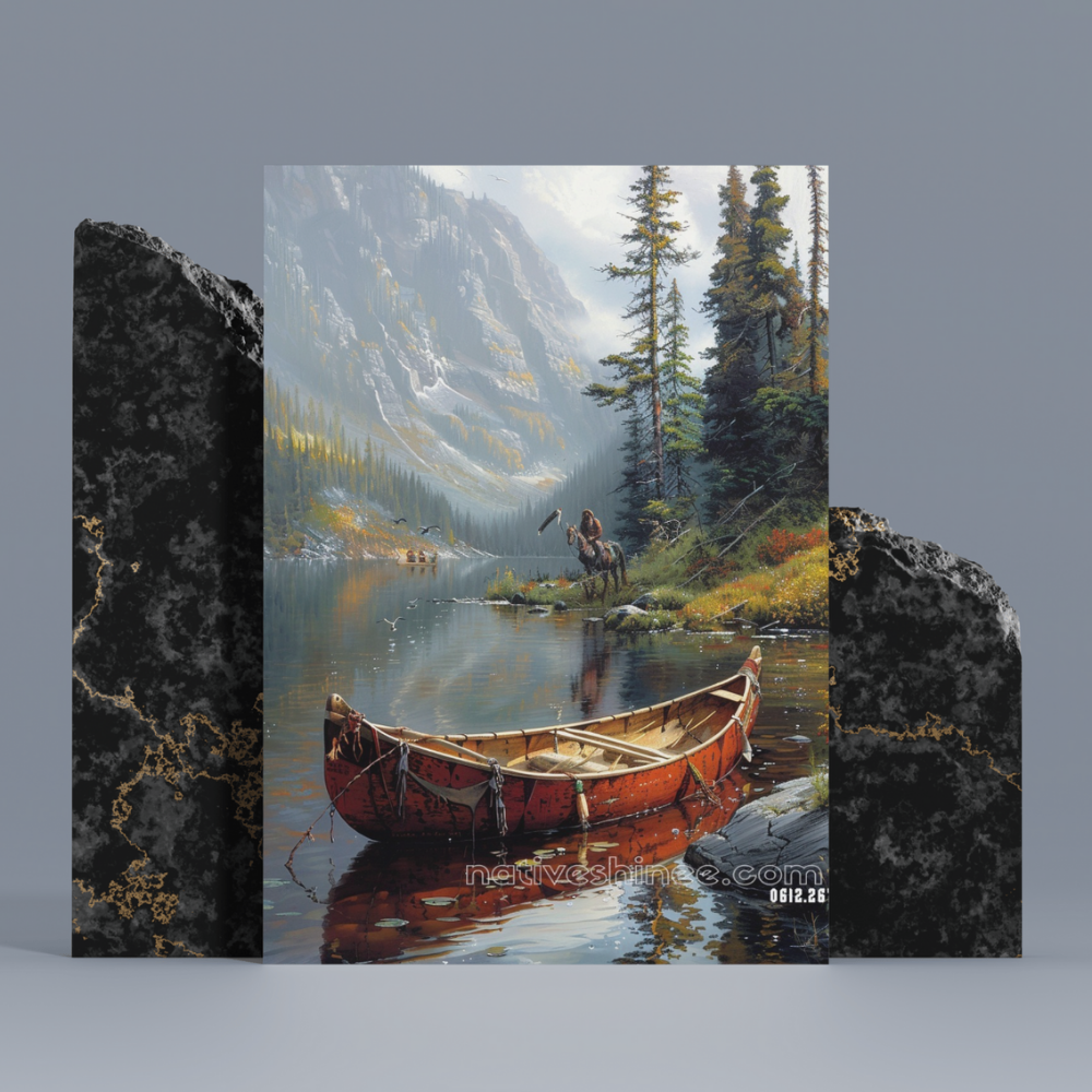 This stunning piece of art captures the untamed beauty of nature, where a lone warrior rides alongside a tranquil river. A canoe drifts softly on the water, its red paint reflecting the surrounding beauty of the wilderness. Towering mountains rise in the distance, with birds soaring freely in the vast sky. The warrior, adorned in traditional regalia, holds a feather in one hand, symbolizing strength, peace, and connection to the natural world. The quiet, reflective waters mirror the serenity of the scene, offering a sense of calm and introspection. This canvas transports you to a world where nature and spirit intertwine, evoking both awe and peace.