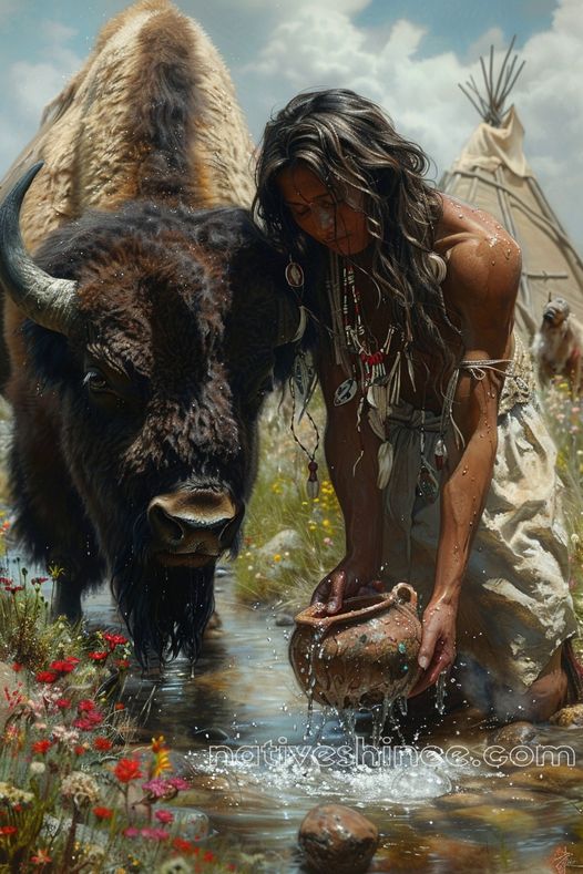 This canvas artwork highlights the sacred bond between a Native American and the bison, a revered animal symbolizing strength and survival. The serene moment by the stream, where the figure kneels to collect water, reflects a harmonious coexistence with nature. The bison, standing tall and calm, represents resilience and the profound respect for life in Native American culture. The attention to detail in the figure’s attire and the gentle flow of water brings the scene to life, offering a visual meditation on nature’s blessings and the spiritual connection shared with the land.