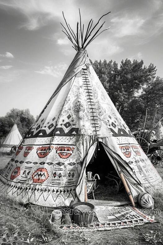 This beautifully adorned teepee stands as a timeless symbol of Native American heritage, crafted with intricate patterns that tell stories of the land, the people, and their connection to nature. The selective use of color highlights the vibrant red and black geometric designs, which contrast against the monochromatic surroundings, drawing attention to the heart of the teepee as a place of warmth and community. Set under a serene sky, it invites viewers to imagine the peaceful, communal life that once thrived here, reminding us of the importance of preserving cultural traditions.