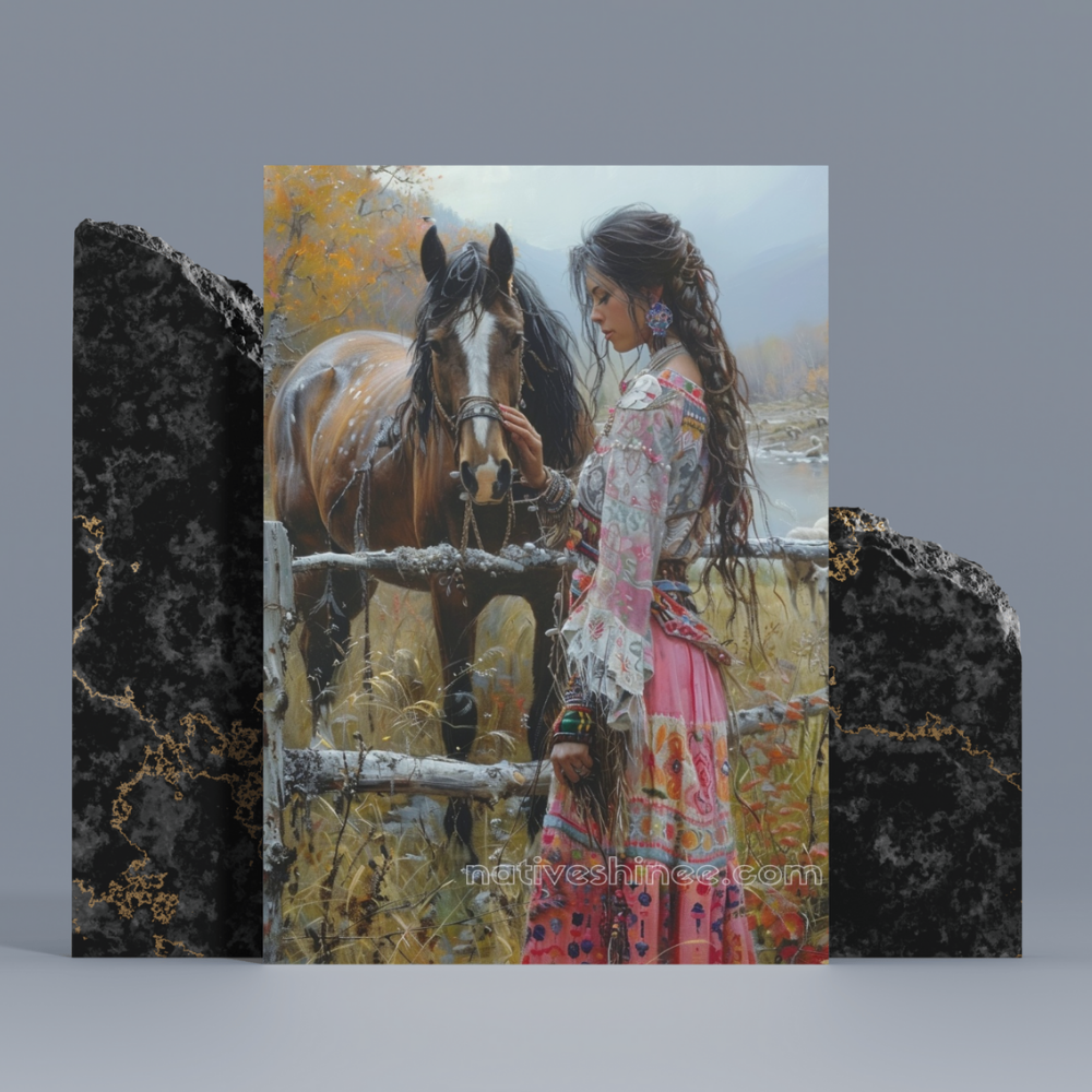 This captivating canvas captures a quiet moment of serenity between a Native American woman and her horse. Their bond, framed by the peaceful autumn landscape, reflects the deep connection between the people and the natural world. The beautiful embroidered dress and the vibrant autumnal colors evoke a sense of grace and strength. This piece invites you to feel the harmony and spirit of the Native American way of life.