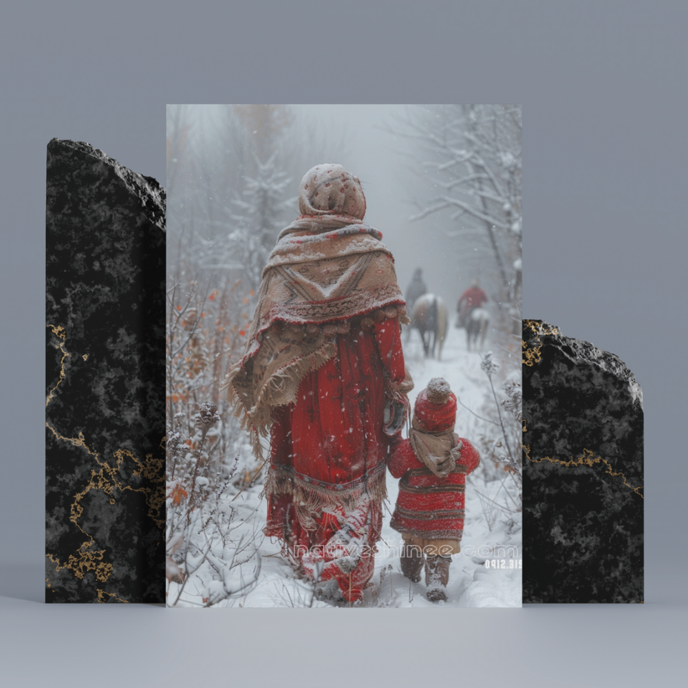 Amidst a snow-laden landscape, a mother and child stand together, surrounded by the quiet beauty of winter’s embrace. The soft snowflakes settle on their cloaks, with the child bundled closely to her, while in the background, riders traverse the snowy path ahead. The figure of the mother, strong yet nurturing, guides the future generation through the cold and uncertain world. This moment speaks of resilience, love, and the timeless journey of the Native American spirit.