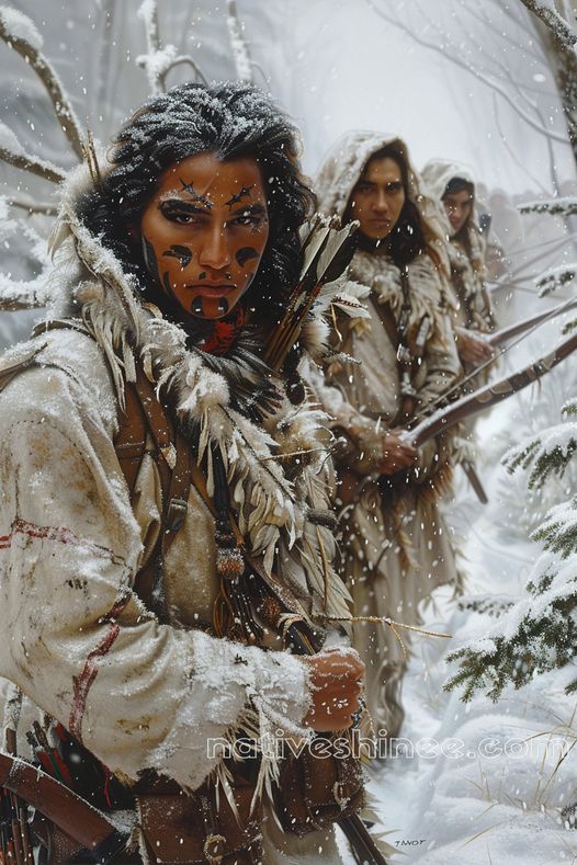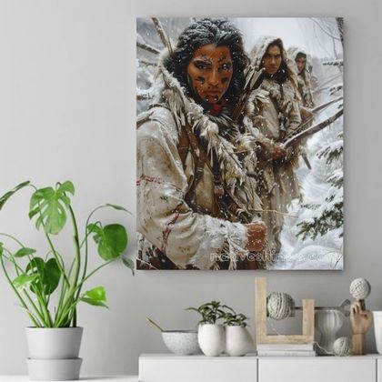 This powerful canvas captures a group of Native American warriors moving silently through a snow-covered forest, their eyes filled with determination. Adorned with feathers and tribal markings, the lead warrior's gaze is intense and unyielding, symbolizing resilience and strength. Clad in furs and traditional winter clothing, they blend into the snowy wilderness, showcasing the warriors' deep connection to their land and their ability to survive harsh elements. This artwork portrays not only their skill in battle but their unity and focus in protecting their people and heritage, a beautiful and haunting depiction of courage in the face of adversity.