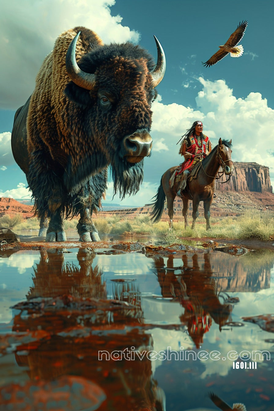 This striking scene brings together the raw power and grace of the American West, as a Native American warrior rides alongside a mighty buffalo. With the open sky above and the rich landscape stretching far into the horizon, the warrior and the buffalo share a deep, unspoken connection that reflects the sacred bond between all living creatures in the wilderness. The eagle soaring overhead symbolizes freedom, strength, and the ancient wisdom passed down through generations. The still water reflects not only the physical presence of the warrior and the bison but also the spiritual unity they share with the land. A tribute to the strength, resilience, and timeless spirit of the Native American people, this canvas captures the harmony between man, animal, and nature, evoking a sense of reverence for the natural world and the sacred duties of stewardship.