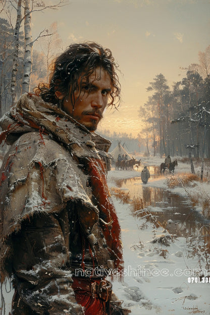This captivating canvas features a lone warrior, standing resolute in the snow-covered wilderness. With his weathered face and piercing gaze, he exudes a sense of inner strength and determination. His worn garments are a testament to the harshness of the environment, while the faint glow of a setting sun casts a warm, golden hue over the scene. Behind him, a caravan of fellow travelers moves quietly through the frozen landscape, a reminder of both the solitude and unity of their journey. This artwork captures the spirit of survival, courage, and the profound bond between humanity and nature.